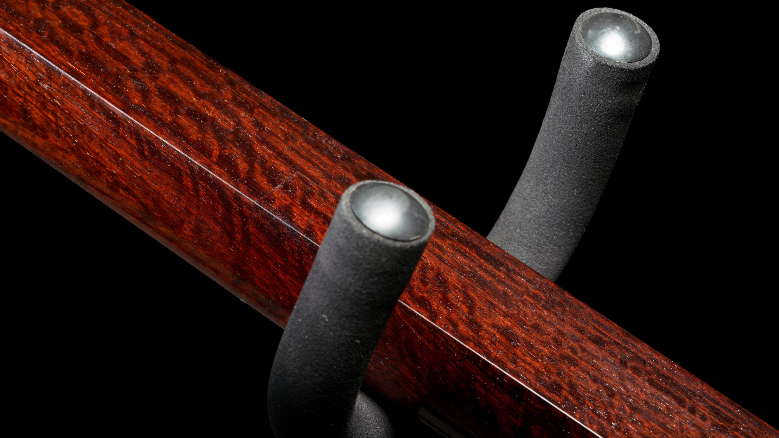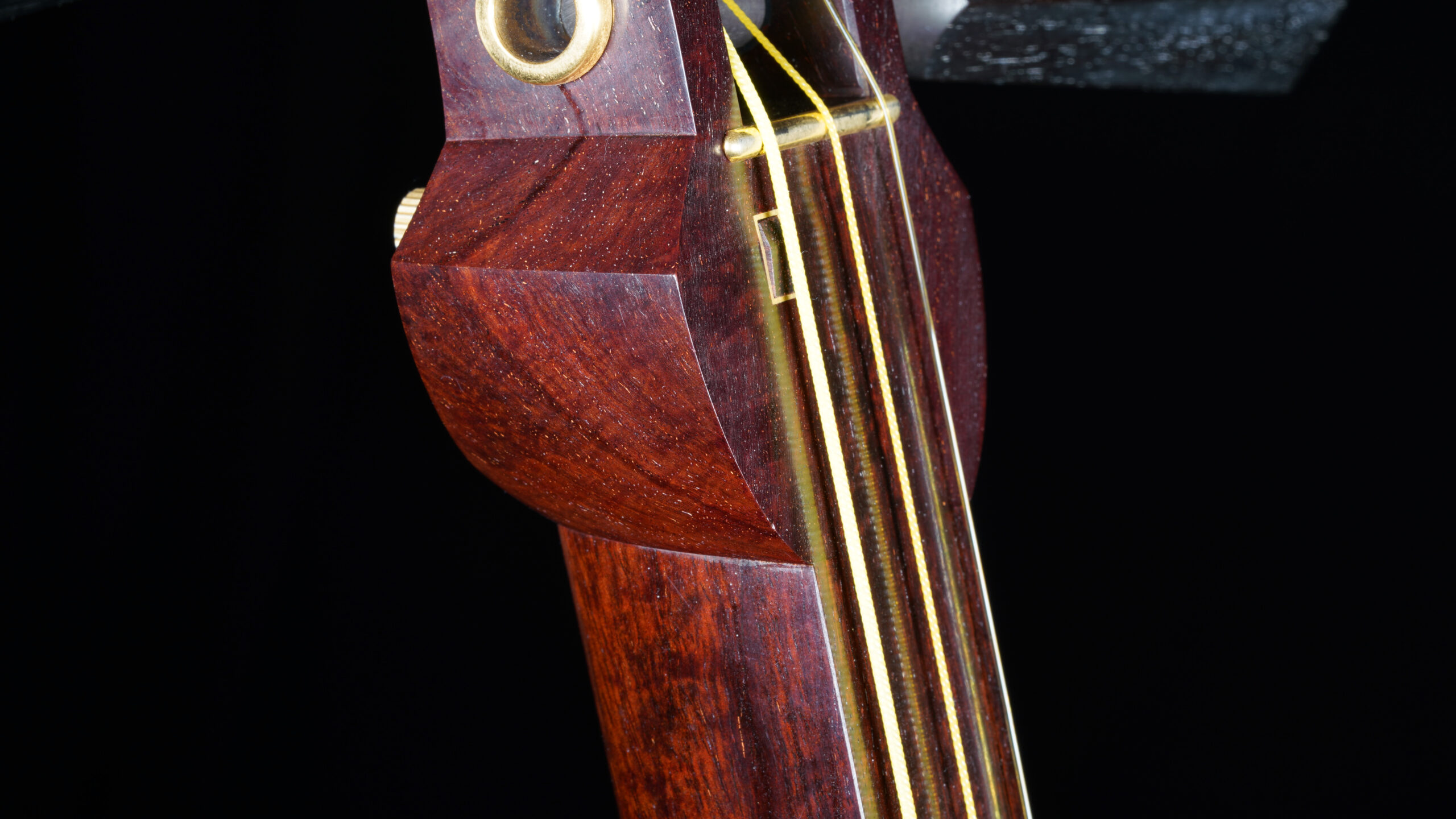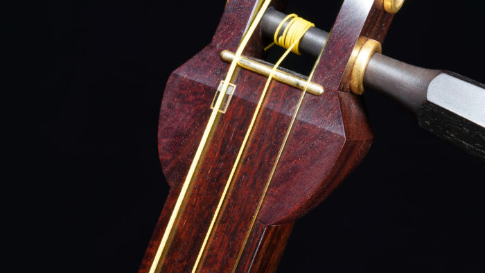 This shamisen features Kinbozo (gold fittings in joints), Komochi Ayasugi (herring bone pattern in dou), Natural Skin, and Tsugaru-Nuri Doukake. The fantastic amount of high quality tochi figuring on the sao is almost impossible to find on brand new kouki shamisen these days, because the newly harvested kouki rarely has any figuring.