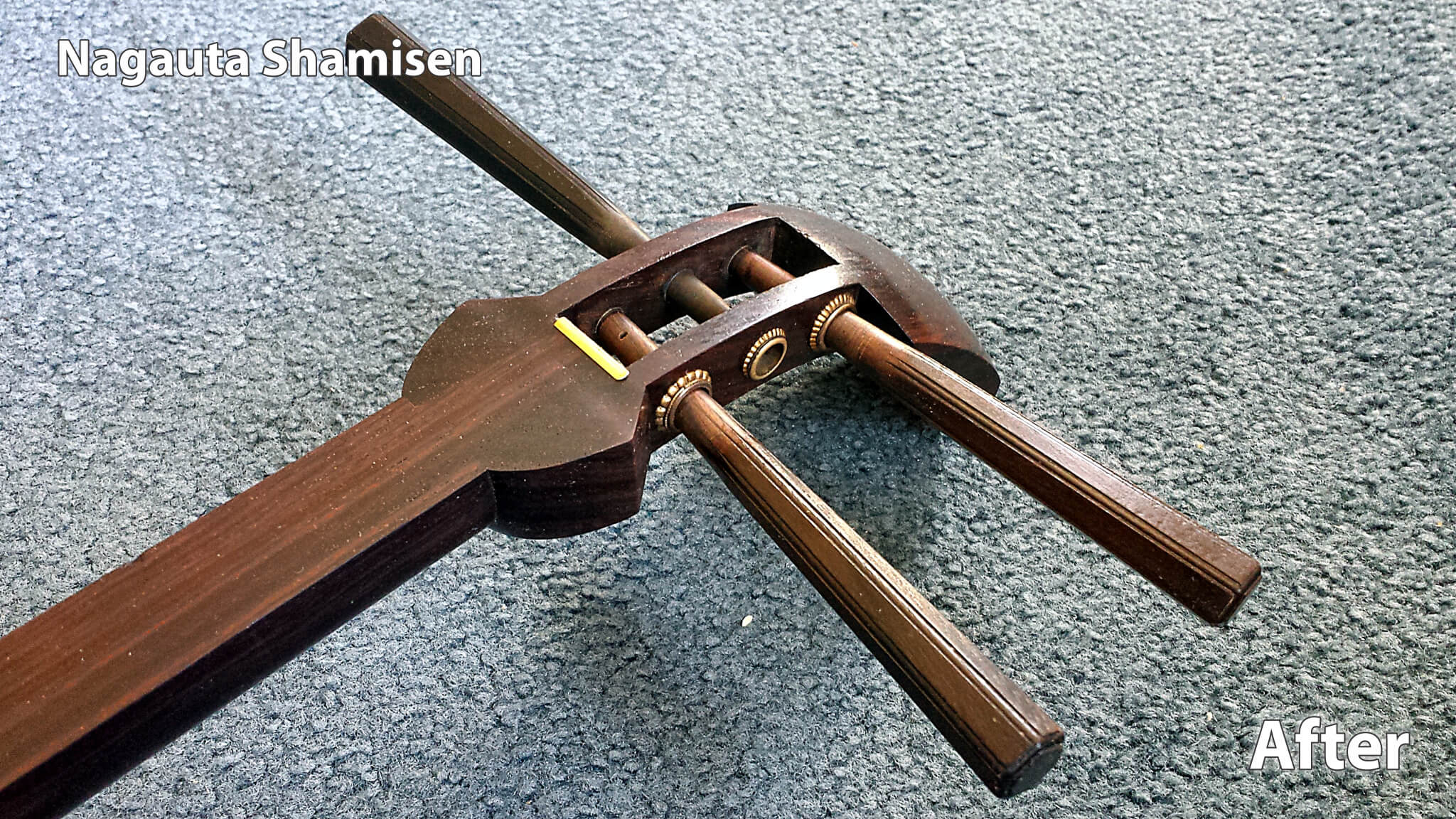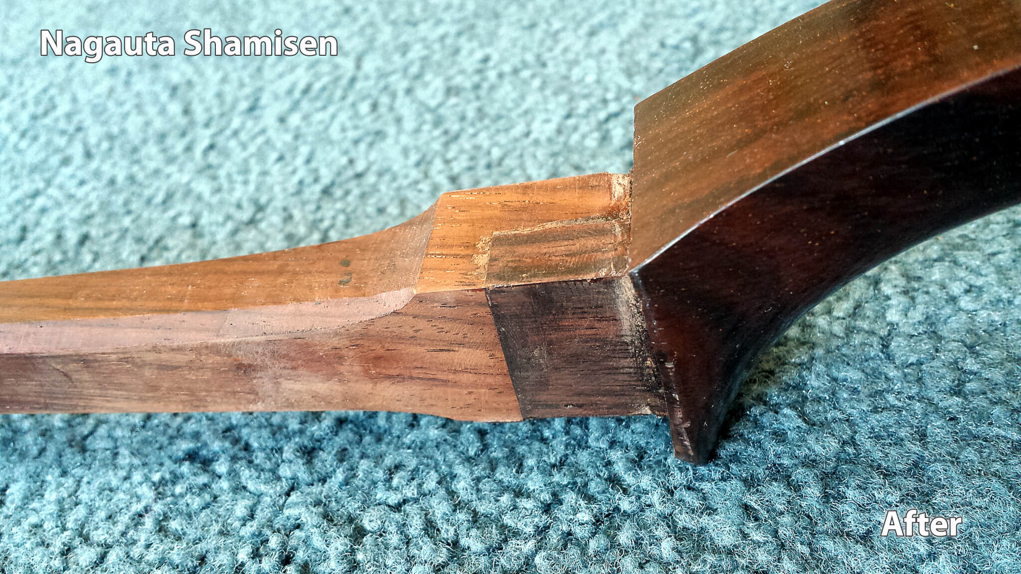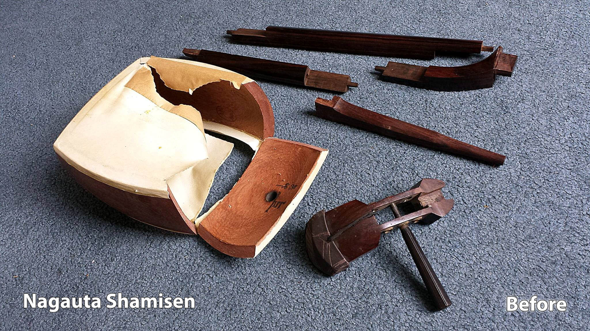Do you have a friend or family member with an antique shamisen sitting broken and dusty in the closet? Is your own shamisen in such disrepair, it’s unplayable? Even though a shamisen is broken into many pieces, often it can be restored to a shiny and like-new condition.