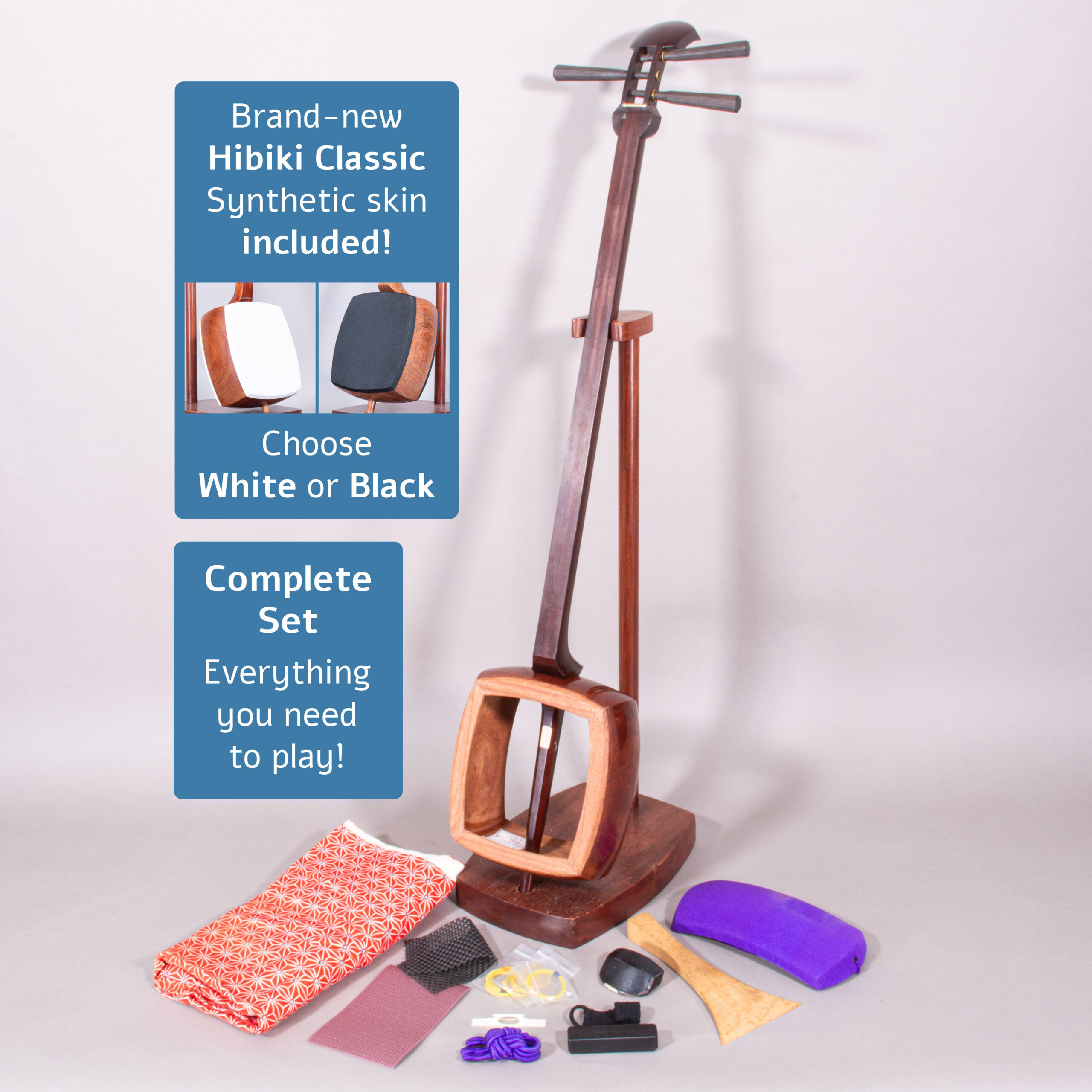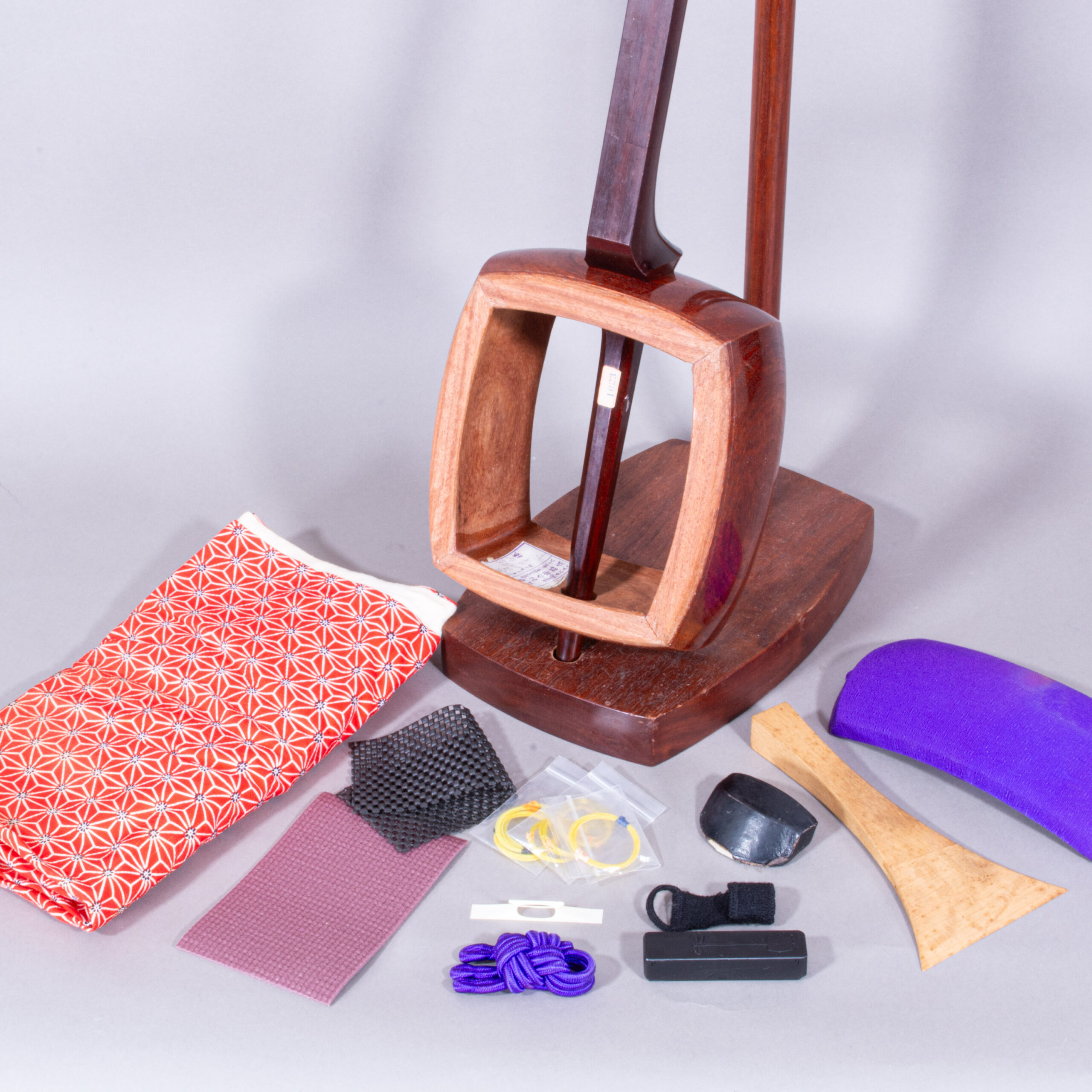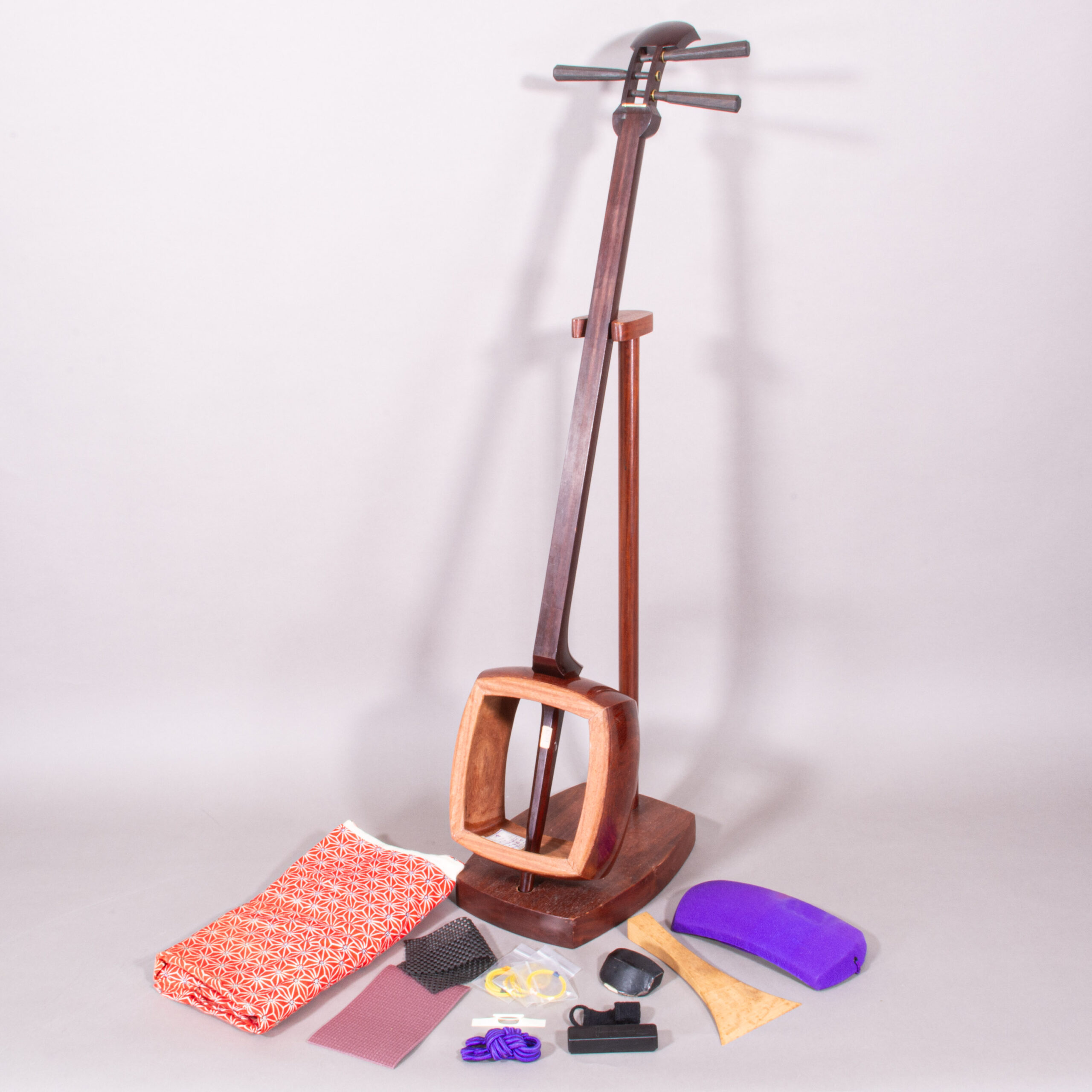 Included is a refurbished Bachi, ebony Itomaki tuning pegs, Doukake protector, Yubikake finger sleeve, complete Ito string set, Dou Gomu protective pad, Neo, Koma, Fujaku Strip and a Naga Fukuro storage bag.