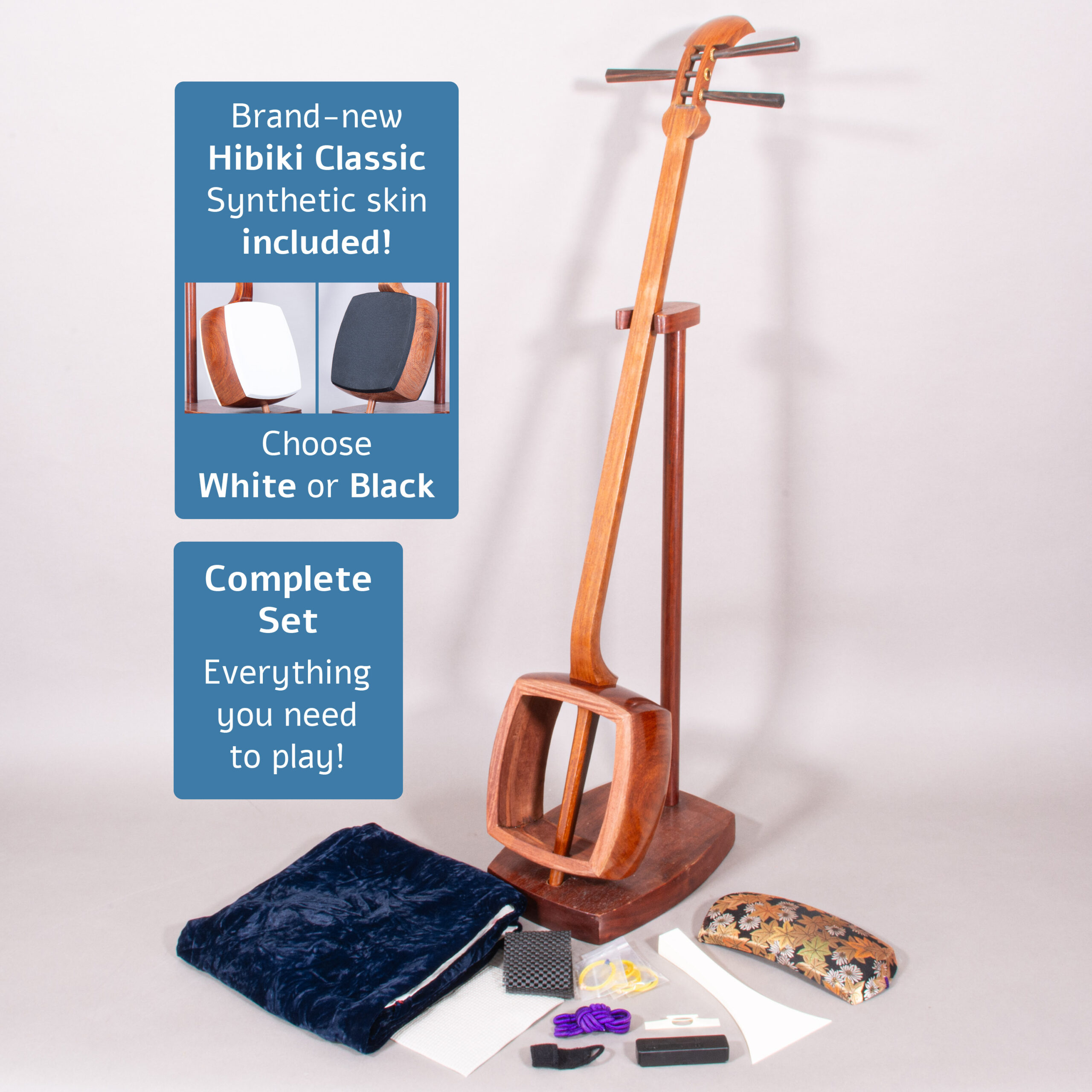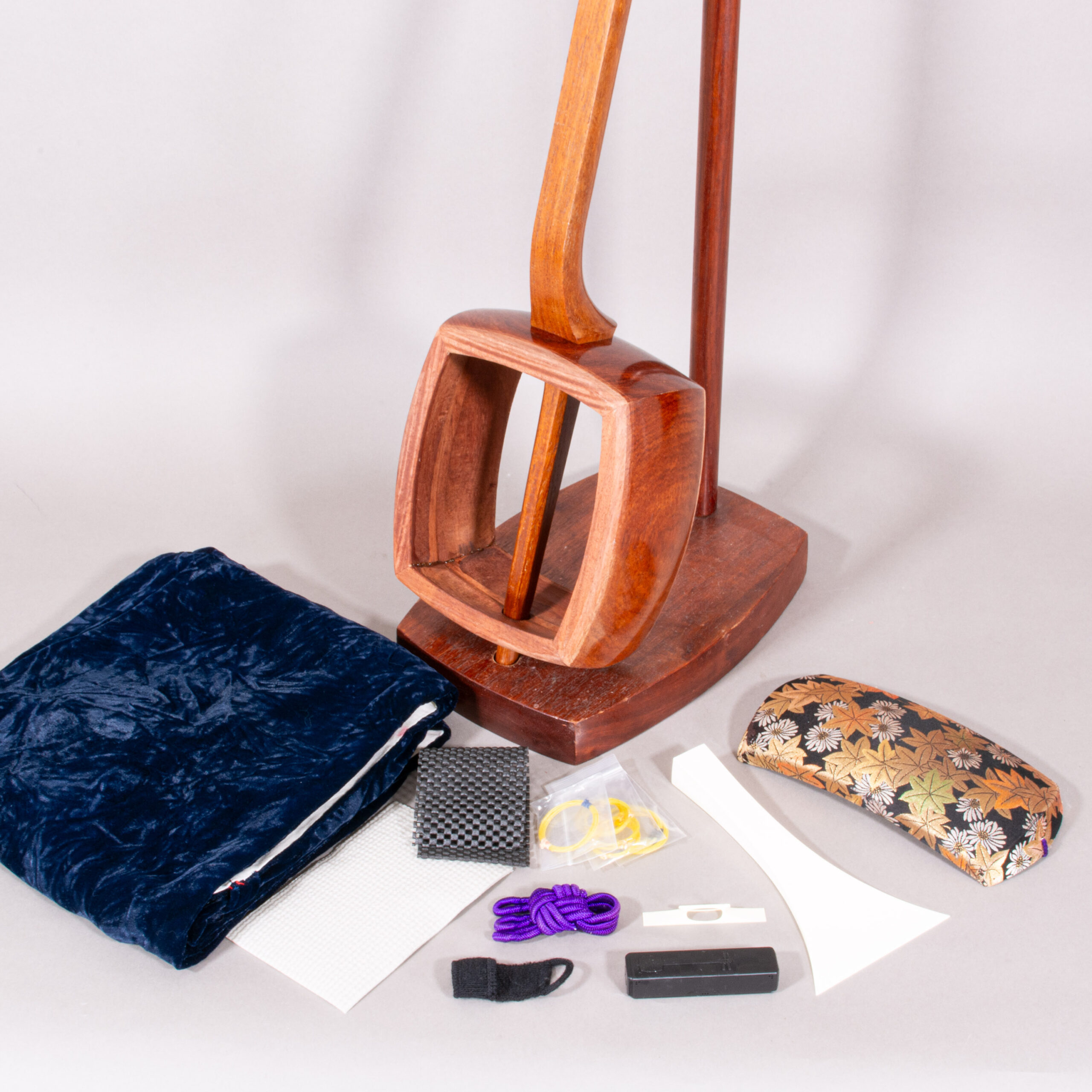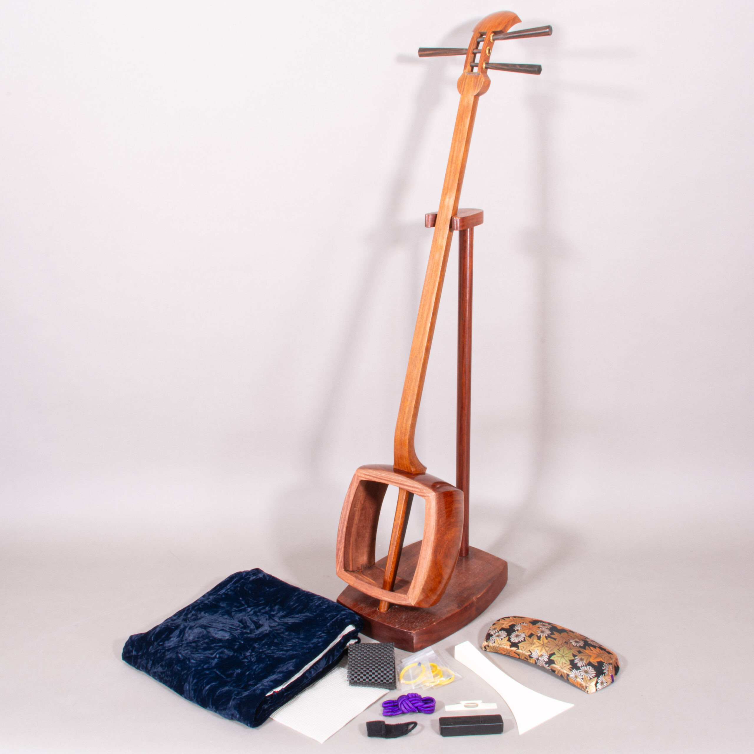 Included is a refurbished Bachi, ebony Itomaki tuning pegs, Doukake protector, Yubikake finger sleeve, complete Ito string set, Dou Gomu protective pad, Neo, Koma, Fujaku Strip and a Naga Fukuro storage bag.