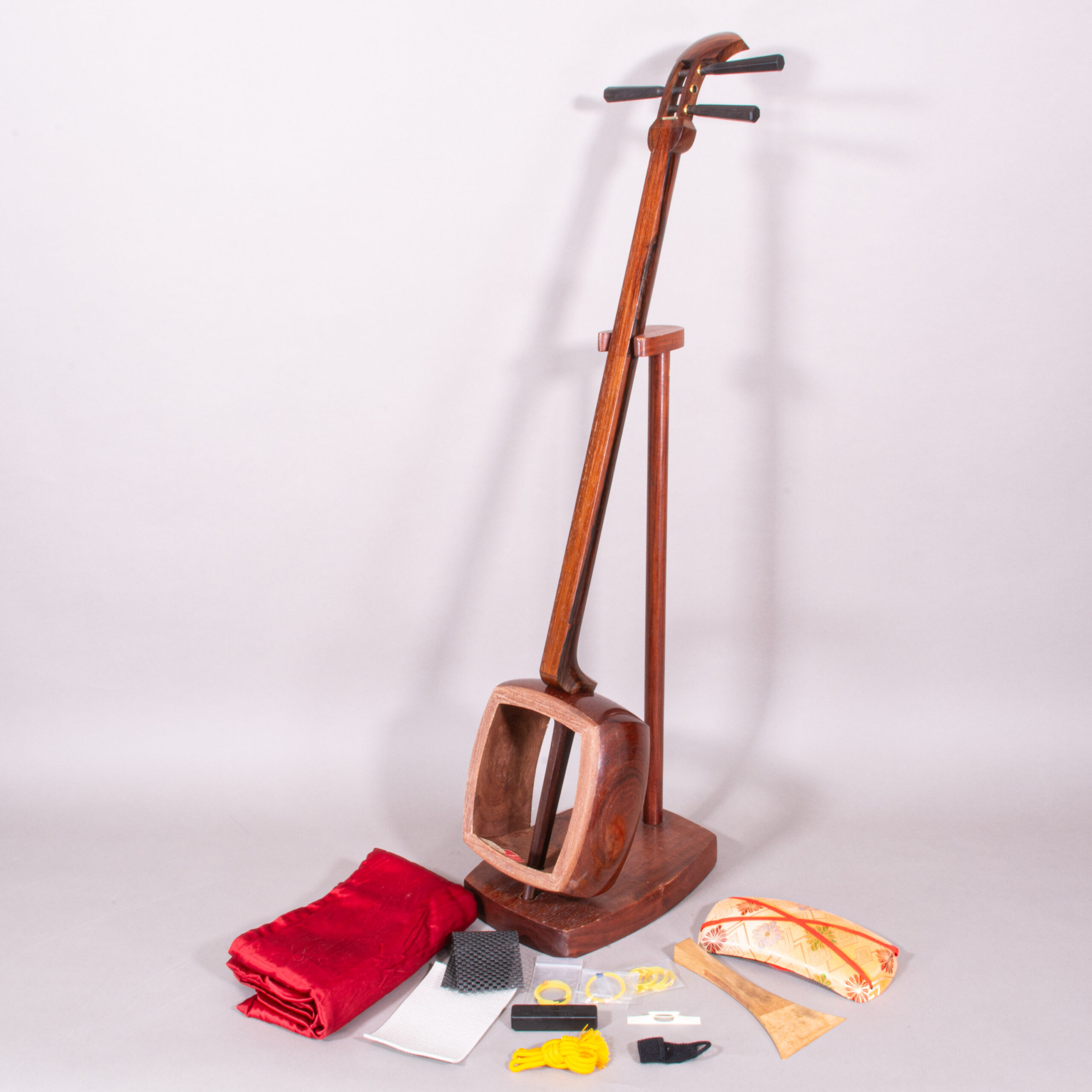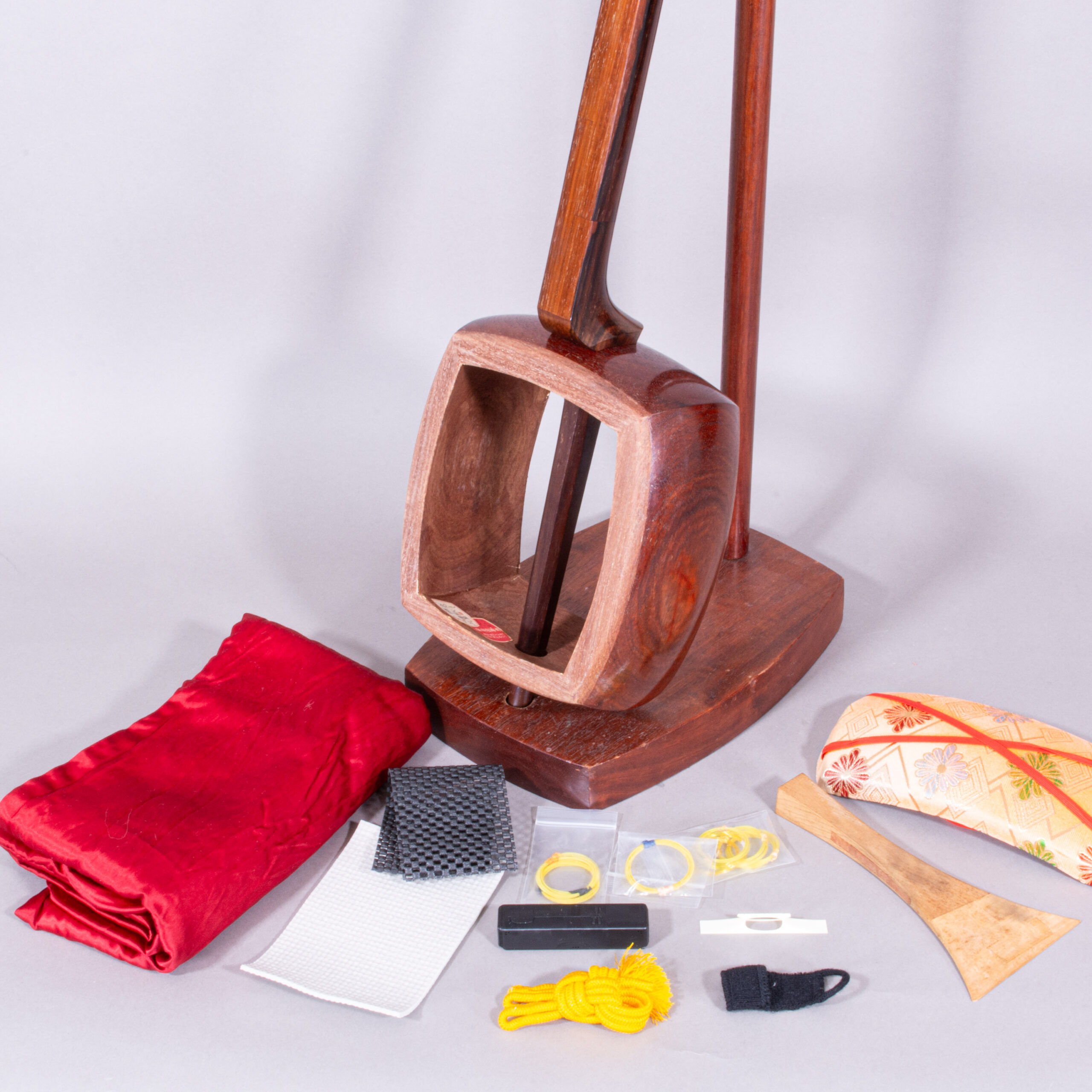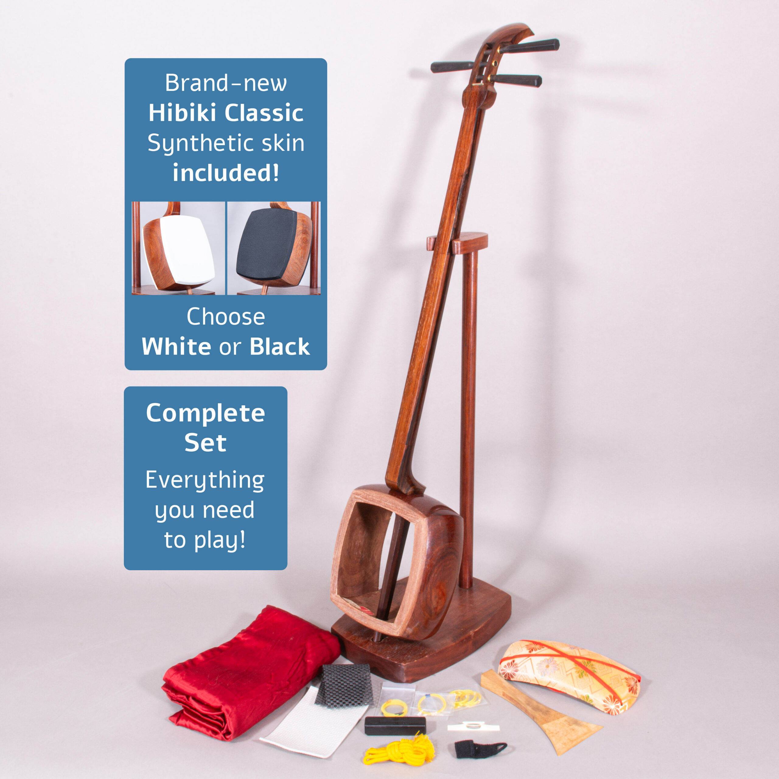 Included is a refurbished Bachi, ebony Itomaki tuning pegs, Doukake protector, Yubikake finger sleeve, complete Ito string set, Dou Gomu protective pad, Neo, Koma, Fujaku Strip and a Naga Fukuro storage bag.
