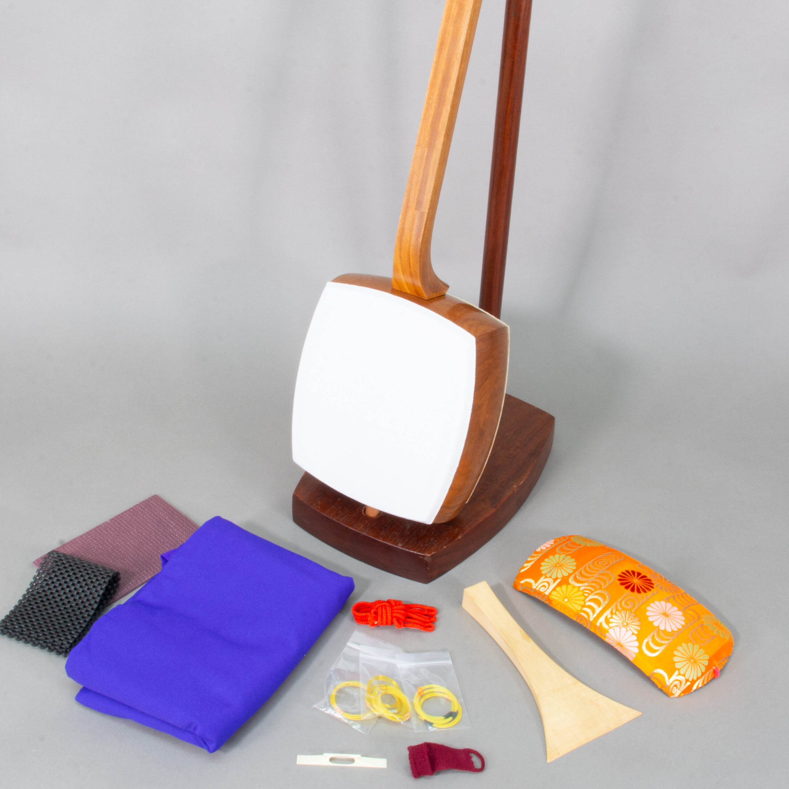 Included is a refurbished Bachi, ebony Itomaki tuning pegs, Doukake protector, Yubikake finger sleeve, complete Ito string set, Dou Gomu protective pad, Neo, Koma, Fujaku Strip, and a Naga Fukuro storage bag.