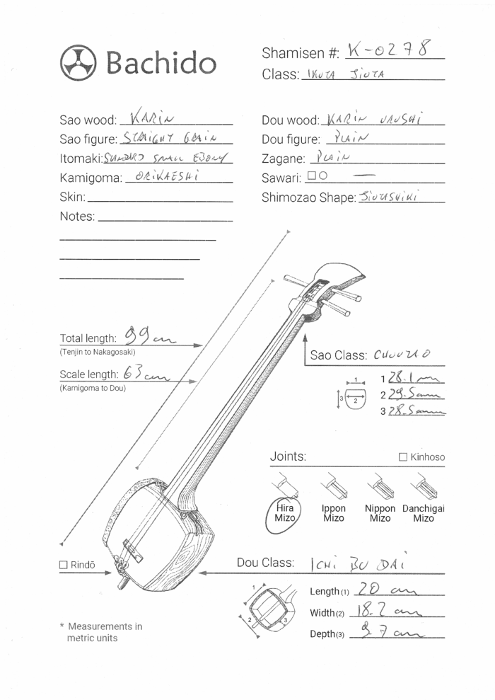 In case you want to specifically play the Jiuta music style, please check with us about replacing the bachi for a Jiuta bachi at a small extra cost.