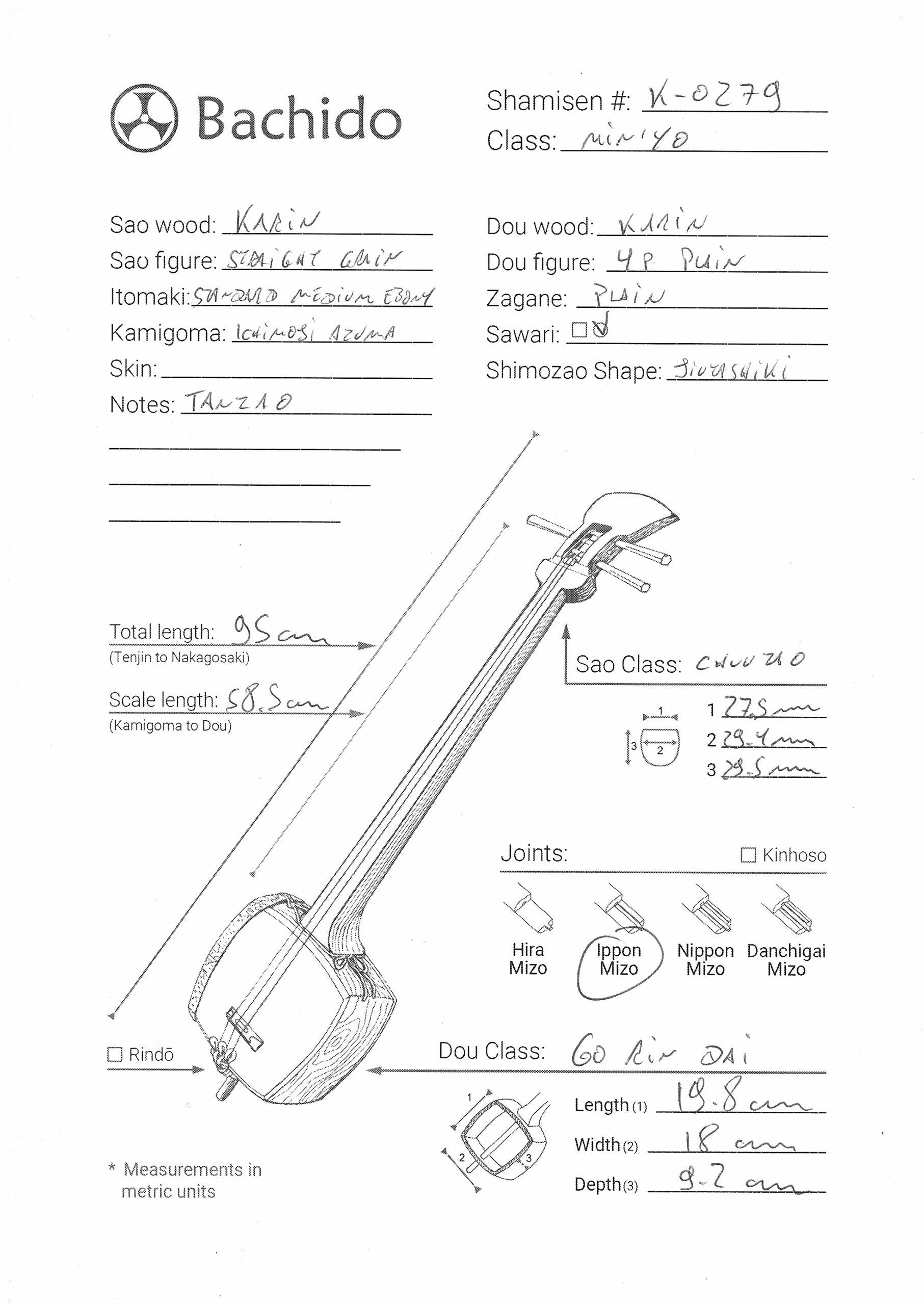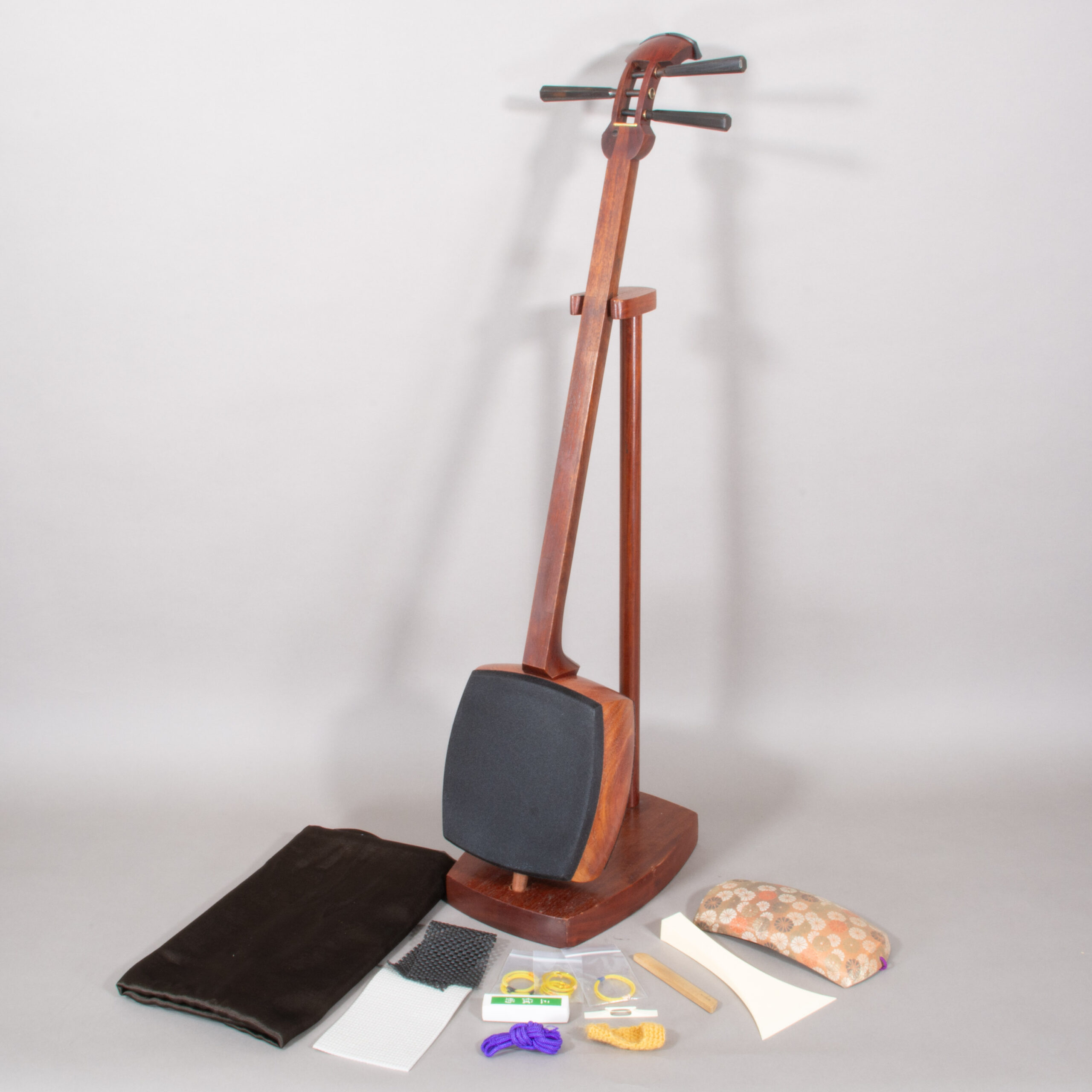 Included is a refurbished Bachi, ebony Itomaki tuning pegs, Doukake protector, Yubikake finger sleeve, complete Ito string set, Dou Gomu protective pad, Neo, Koma, and a Naga Fukuro storage bag.