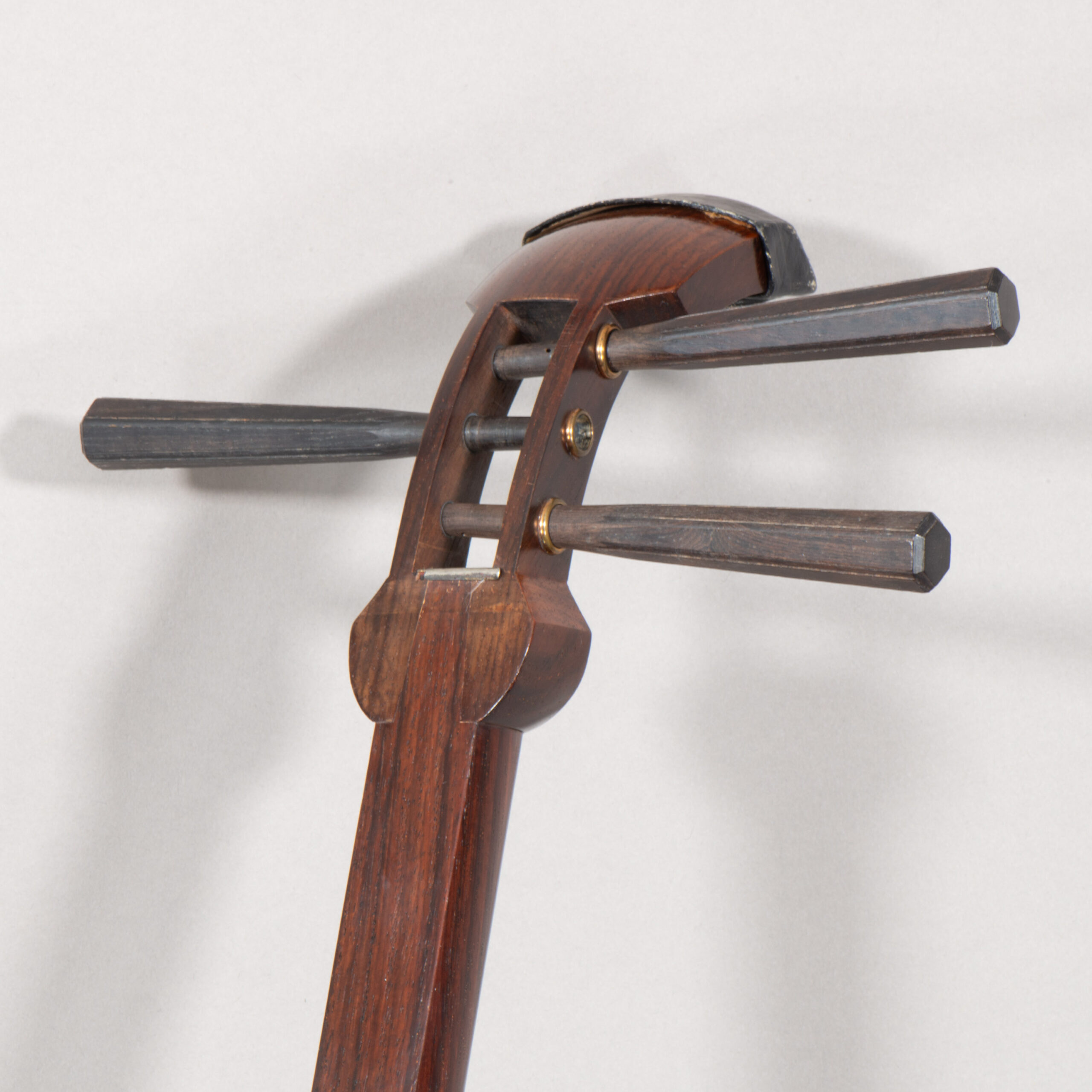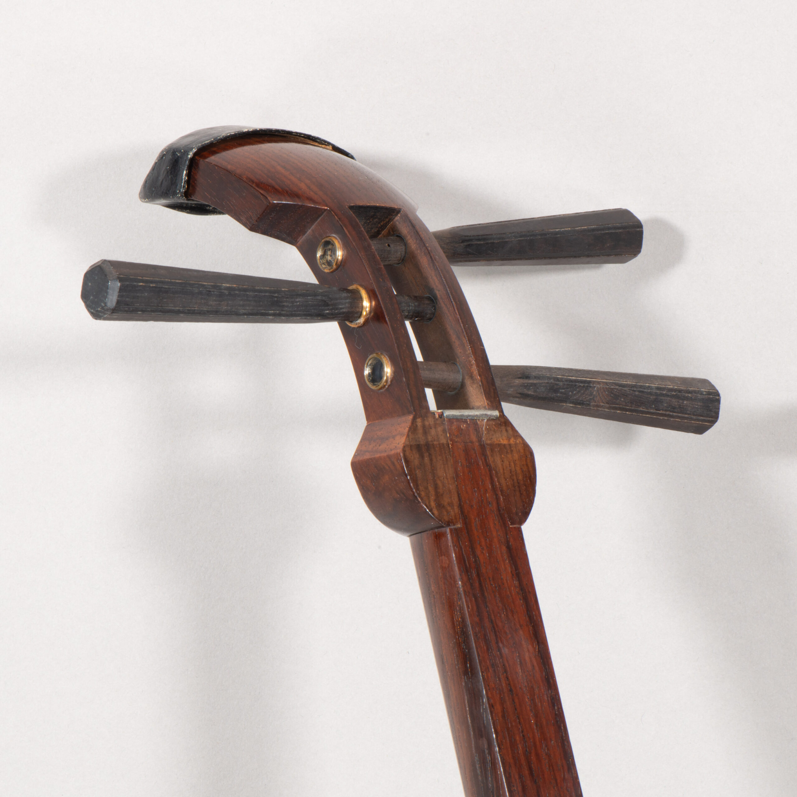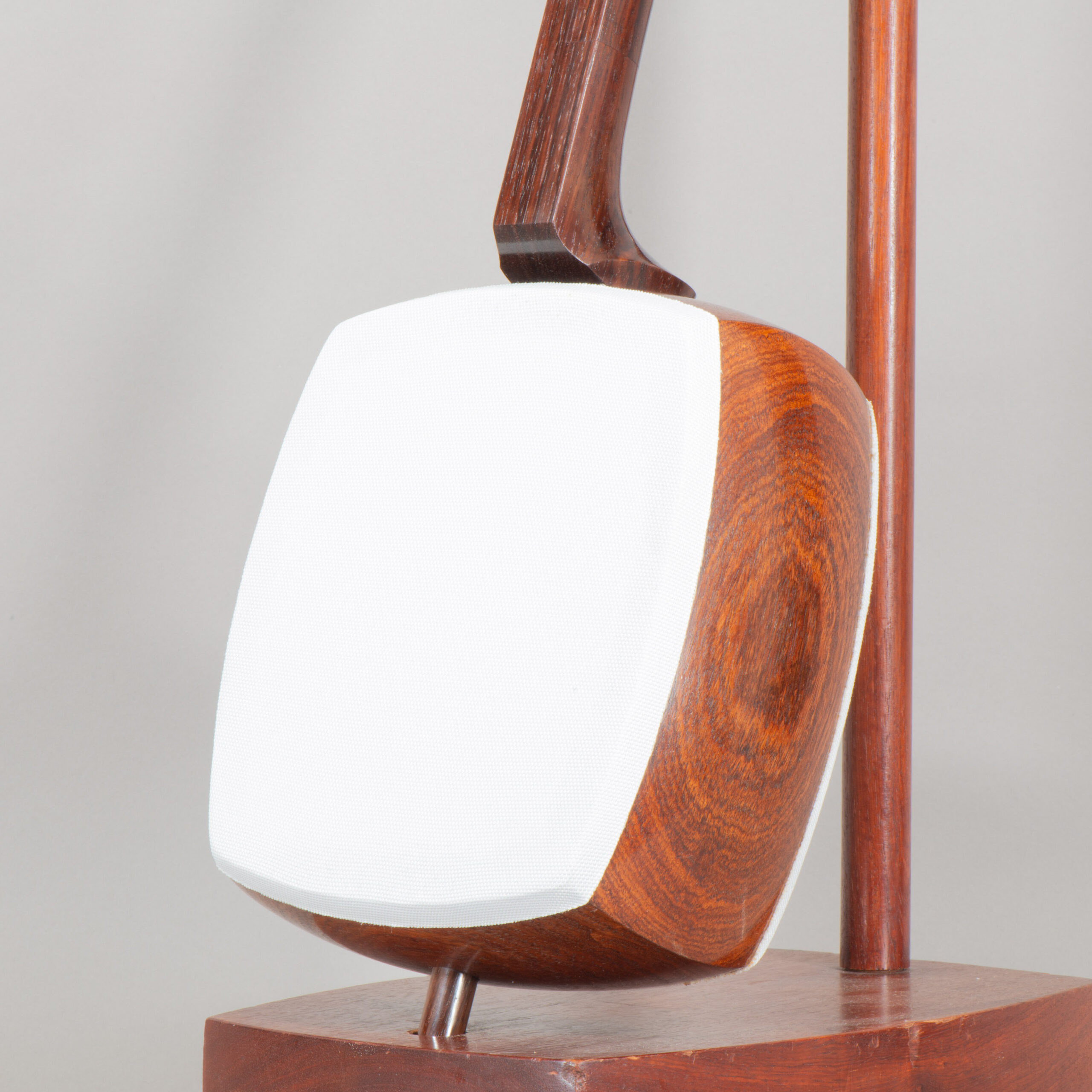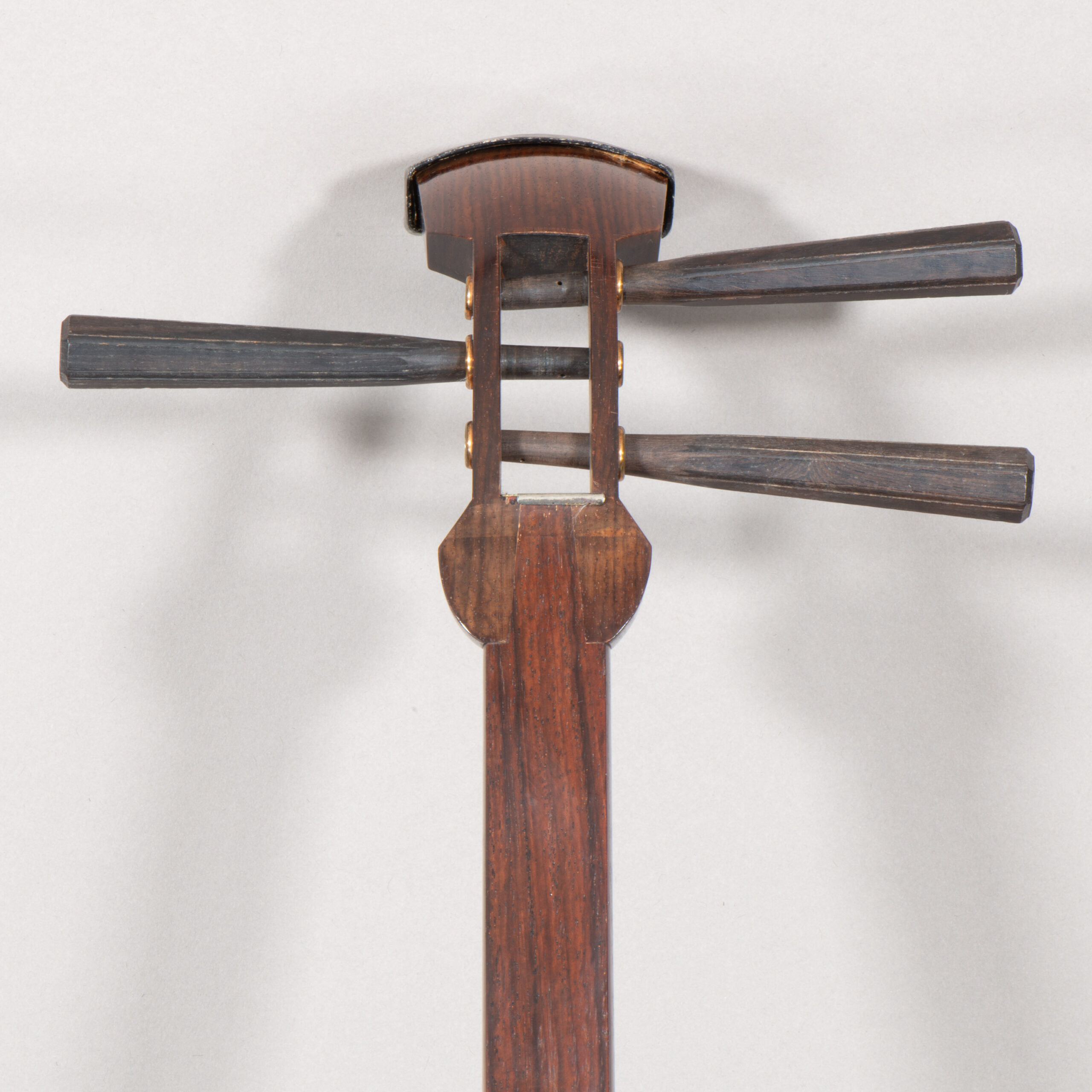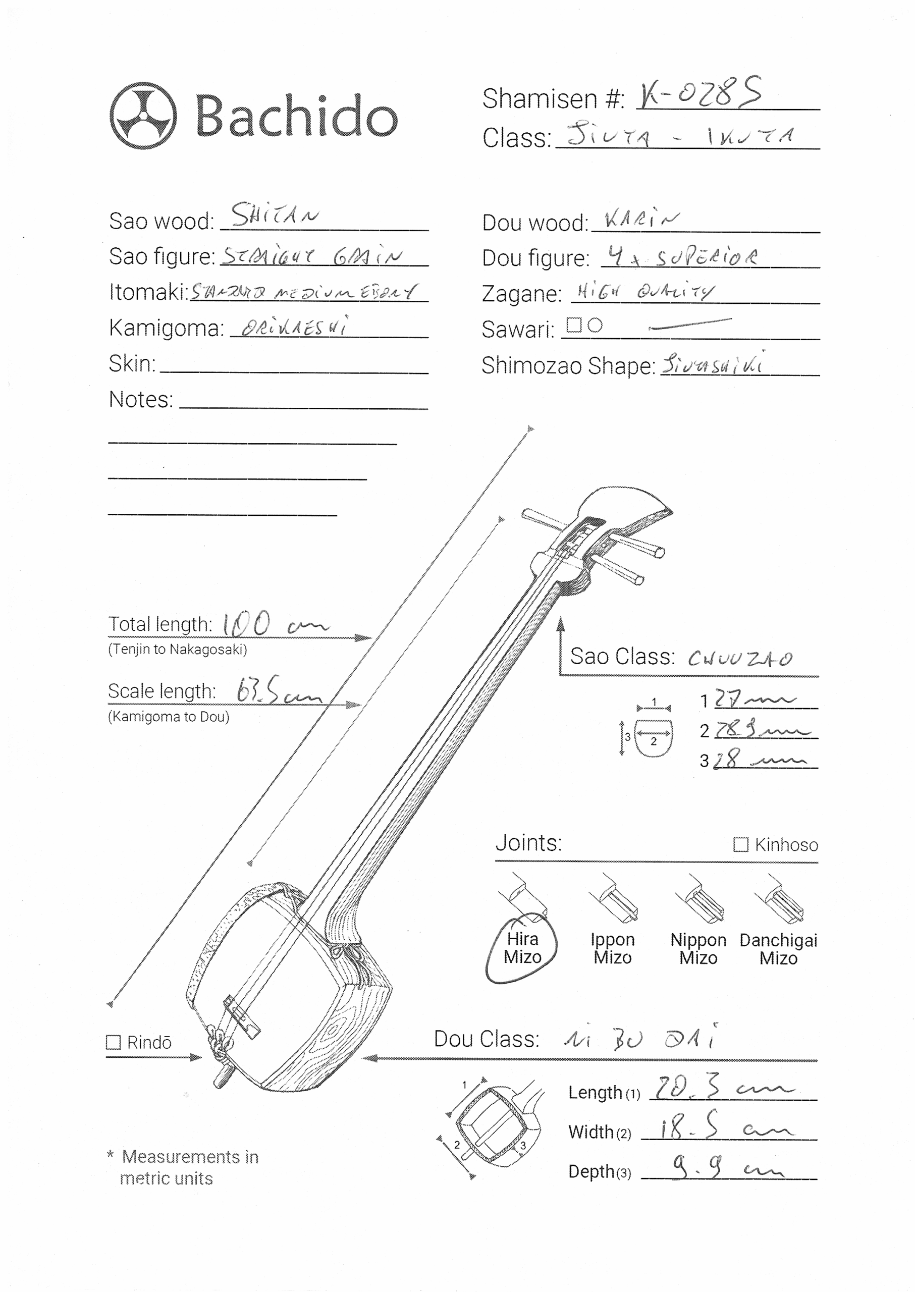 Featuring a deep Shitan wood Sao and Tenjin, paired with a figured Karin Dou, this Shamisen has both visual elegance and superior sound quality.