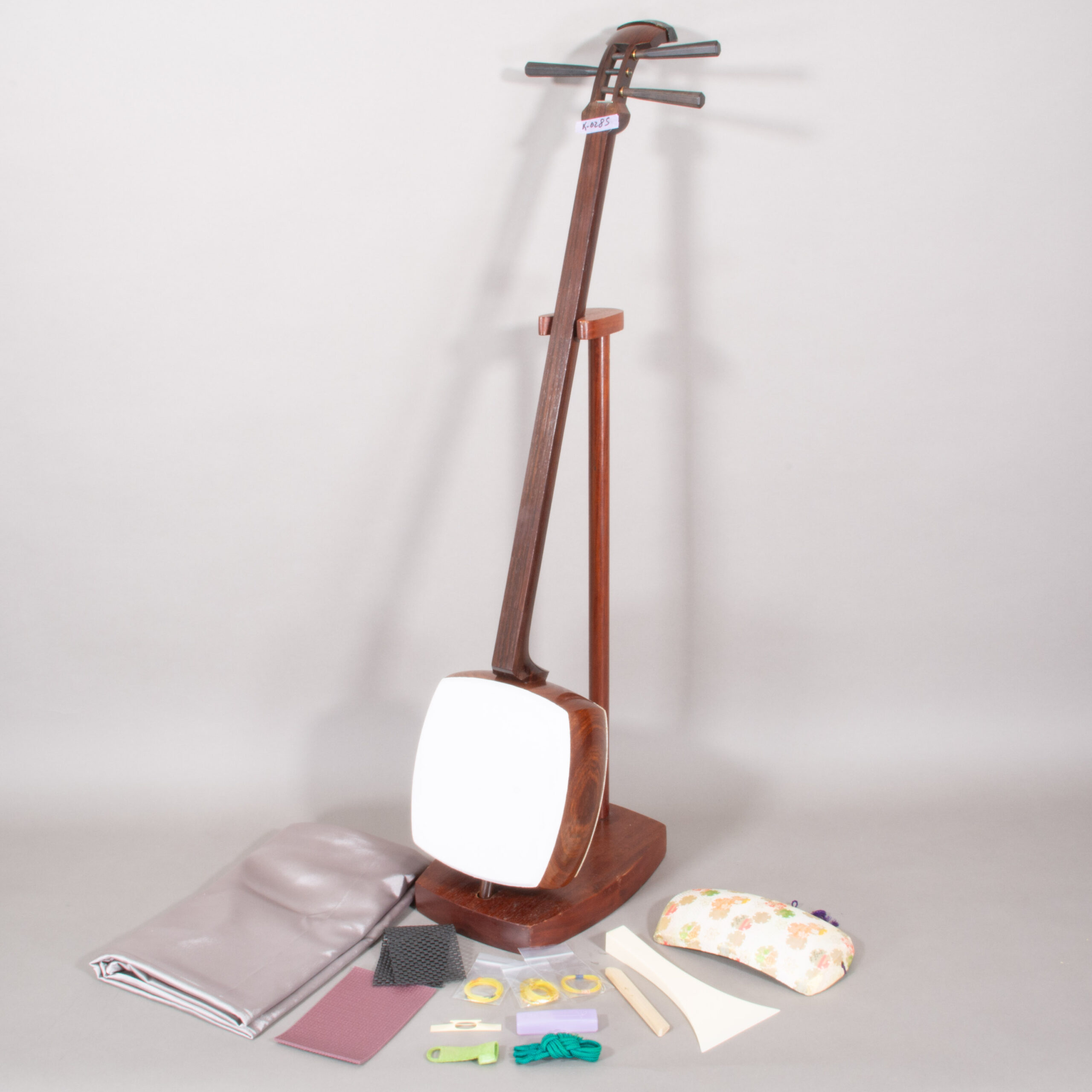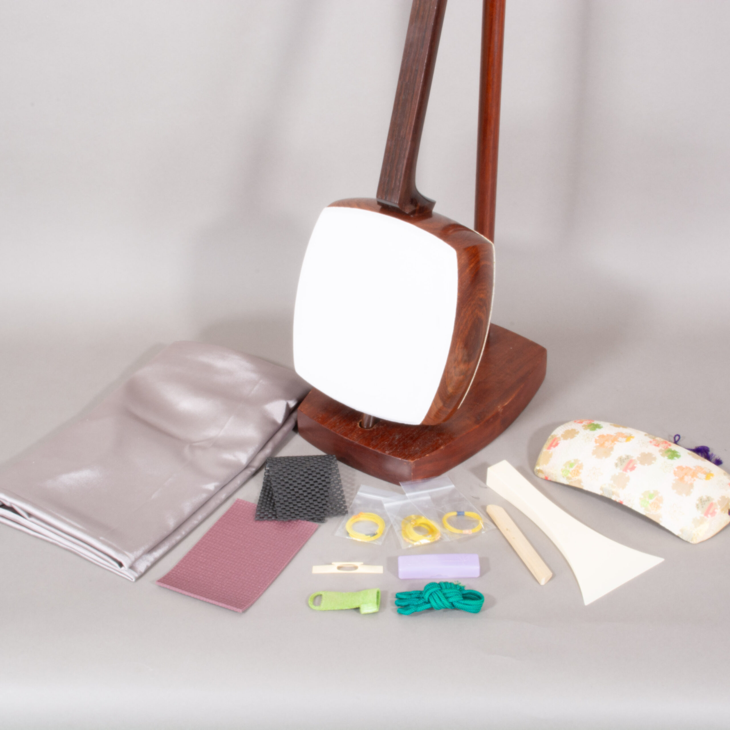 Included is a refurbished Bachi, ebony Itomaki tuning pegs, Doukake protector, Yubikake finger sleeve, complete Ito string set, Dou Gomu protective pad, Neo, Koma, and a Naga Fukuro storage bag.