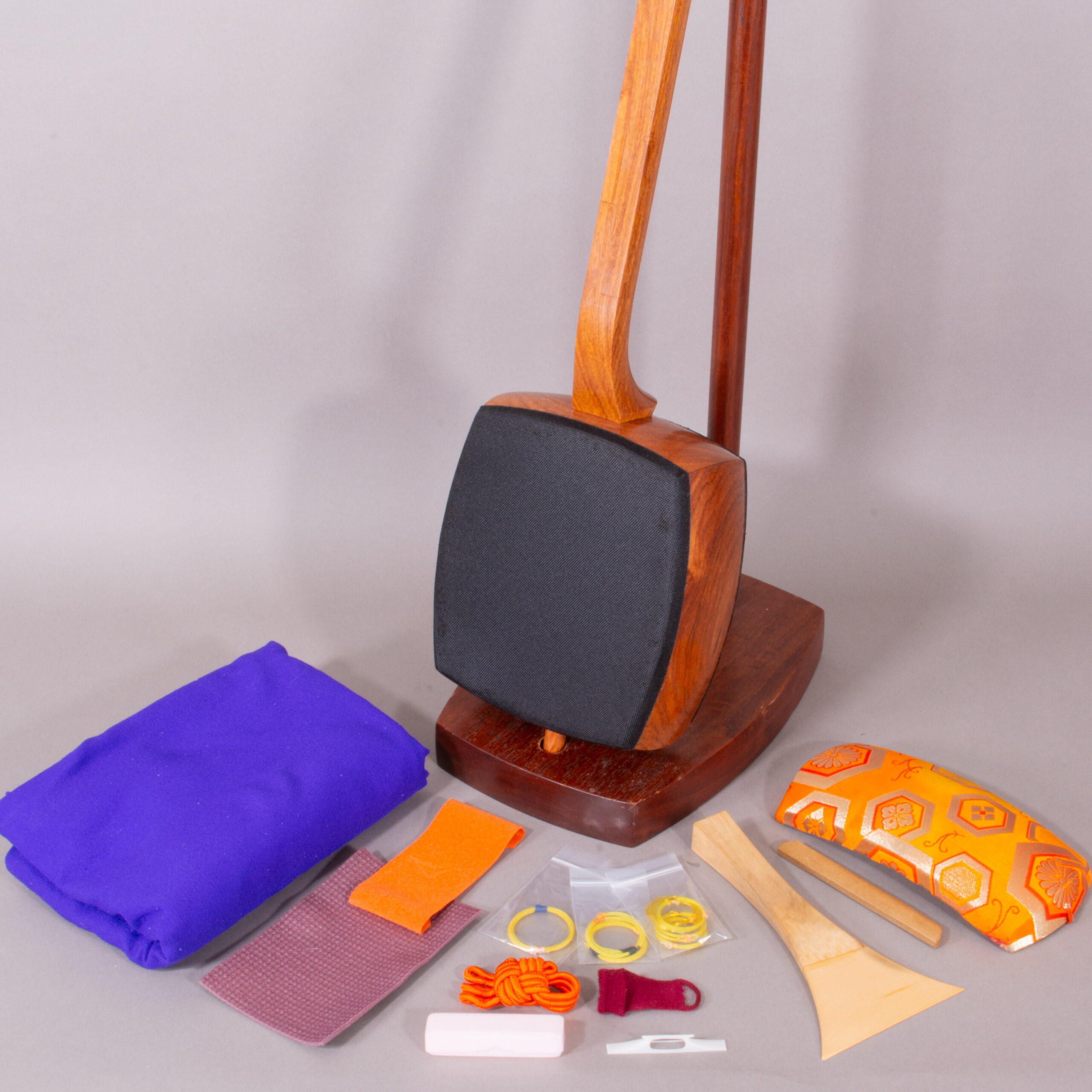 Included is a refurbished Bachi, ebony Itomaki tuning pegs, Doukake protector, Yubikake finger sleeve, complete Ito string set, Dou Gomu protective pad, Neo, Koma, Fujaku Strip and a Naga Fukuro storage bag.