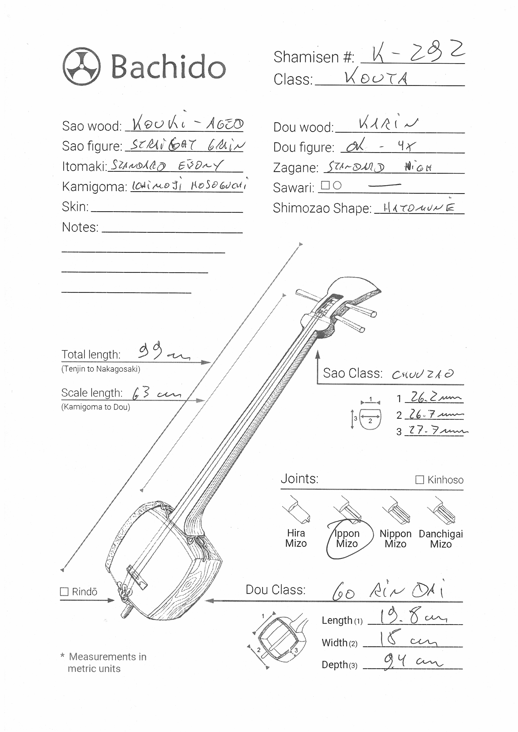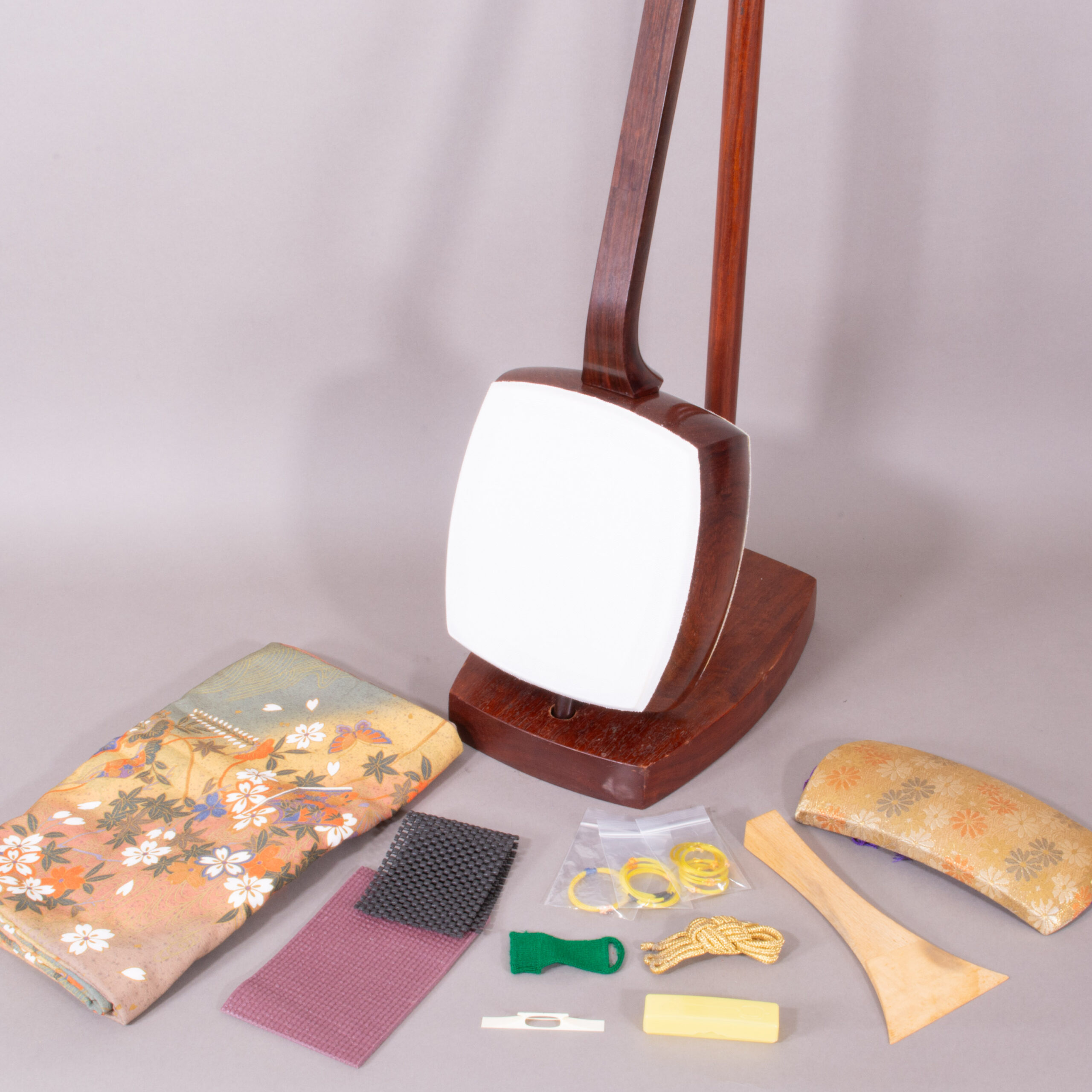 Included is a refurbished Bachi, ebony Itomaki tuning pegs, Doukake protector, Yubikake finger sleeve, complete Ito string set, Dou Gomu protective pad, Neo, Koma, and a Naga Fukuro storage bag.