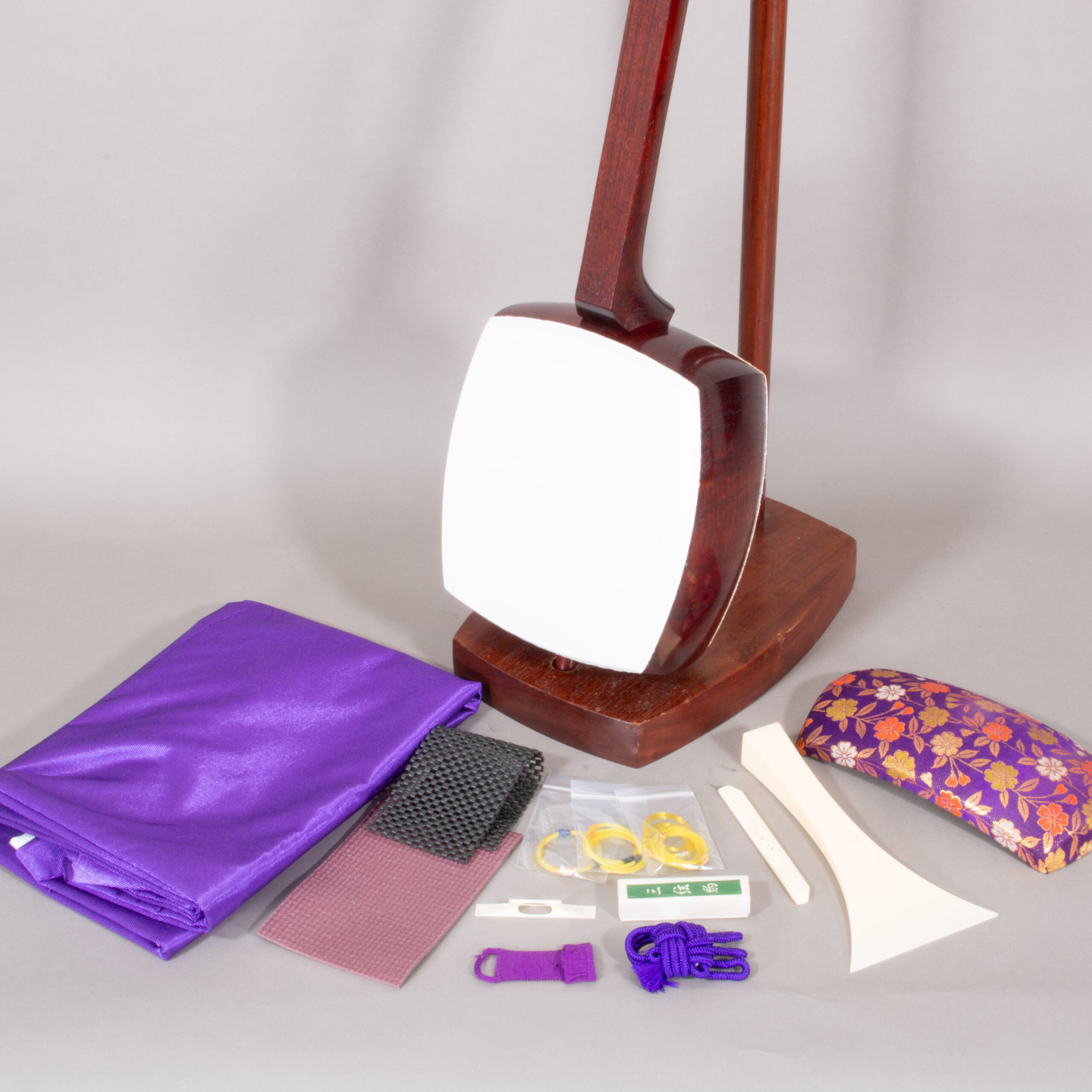Included is a refurbished Bachi, ebony Itomaki tuning pegs, Doukake protector, Yubikake finger sleeve, complete Ito string set, Dou Gomu protective pad, Neo, Koma, Fujaku Strip and a Naga Fukuro storage bag.