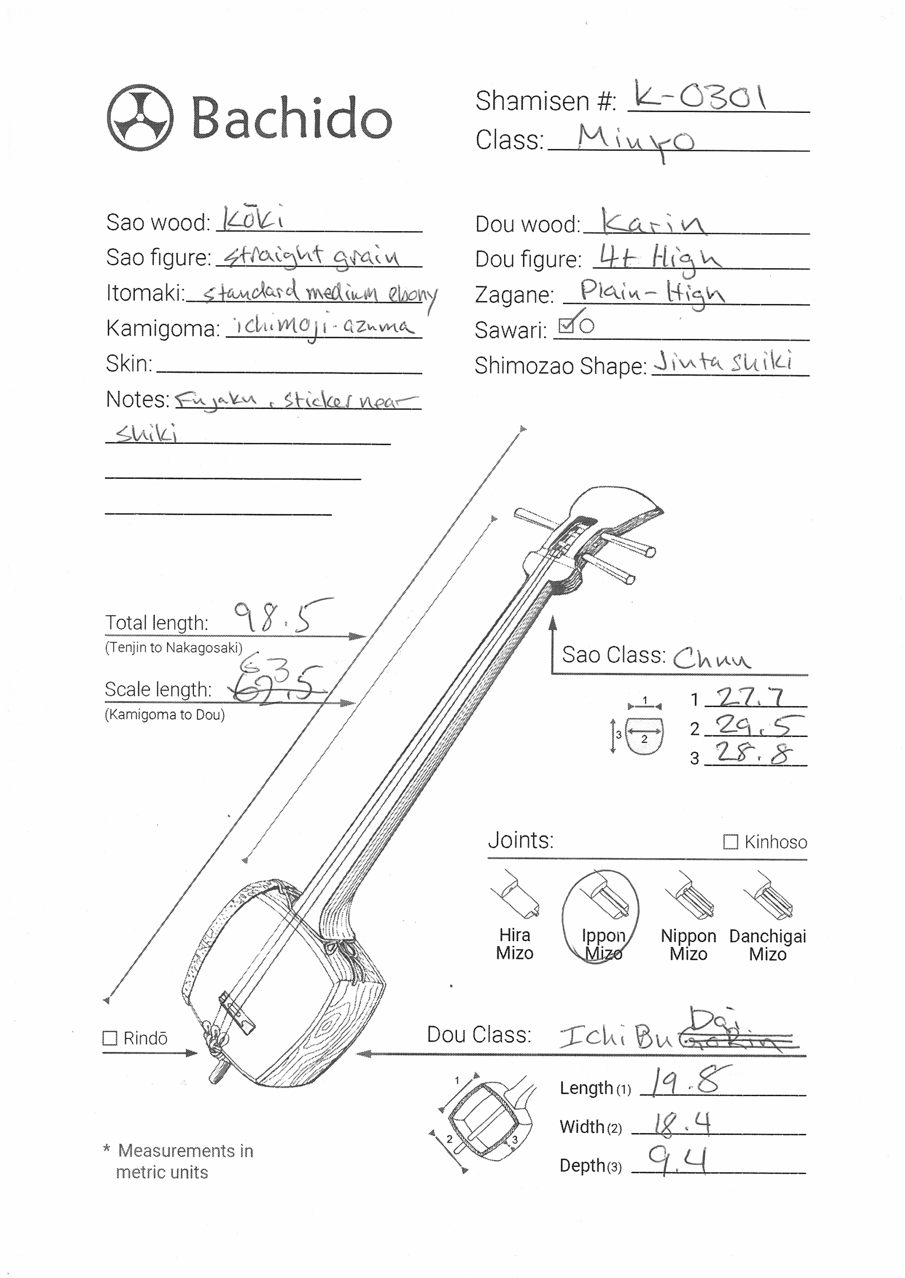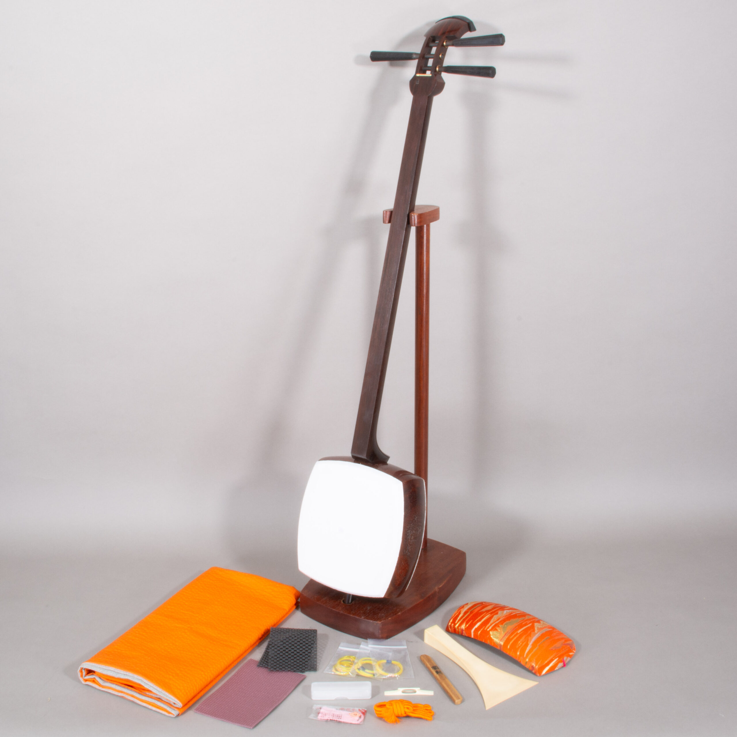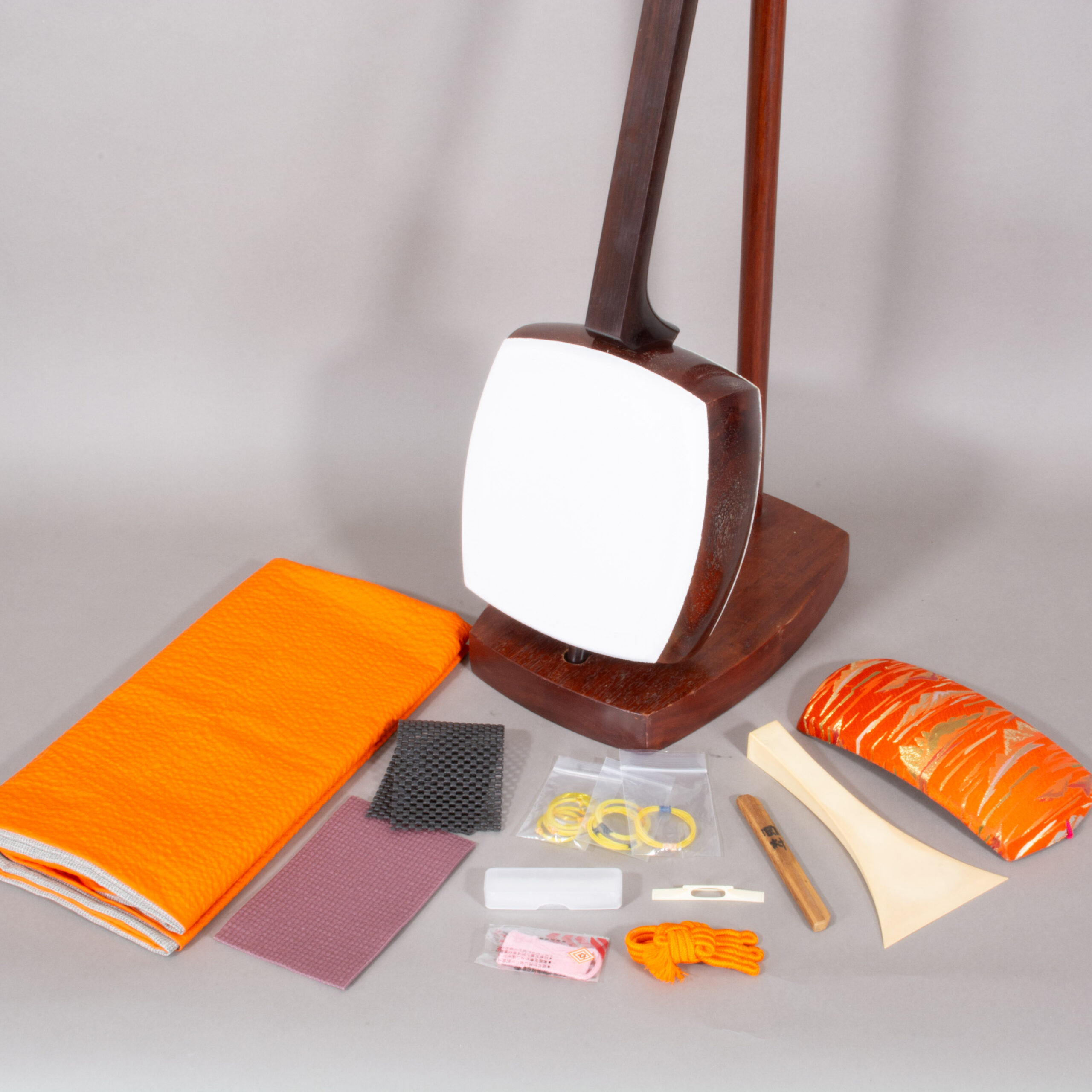 Included is a refurbished Bachi, ebony Itomaki tuning pegs, Doukake protector, Yubikake finger sleeve, complete Ito string set, Dou Gomu protective pad, Neo, Koma, and a Naga Fukuro storage bag.