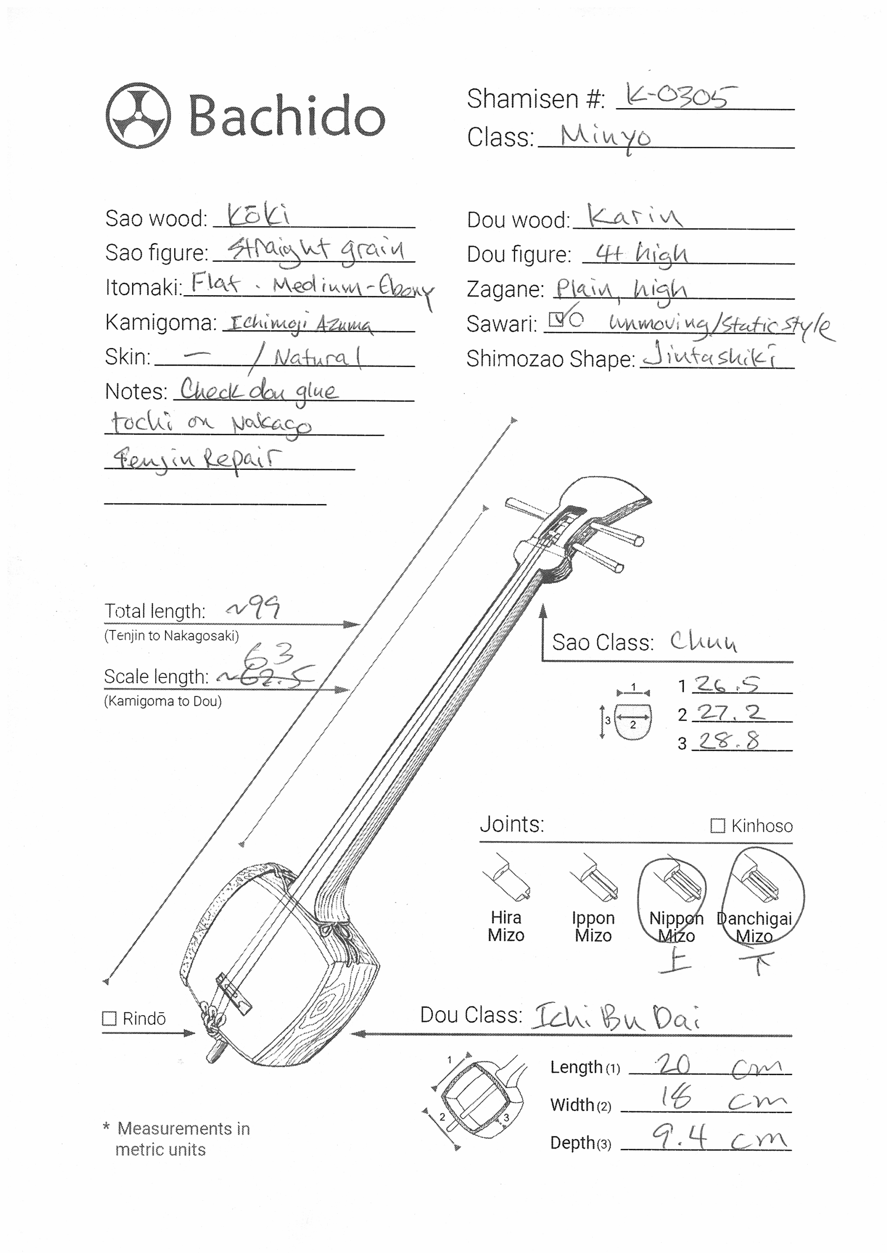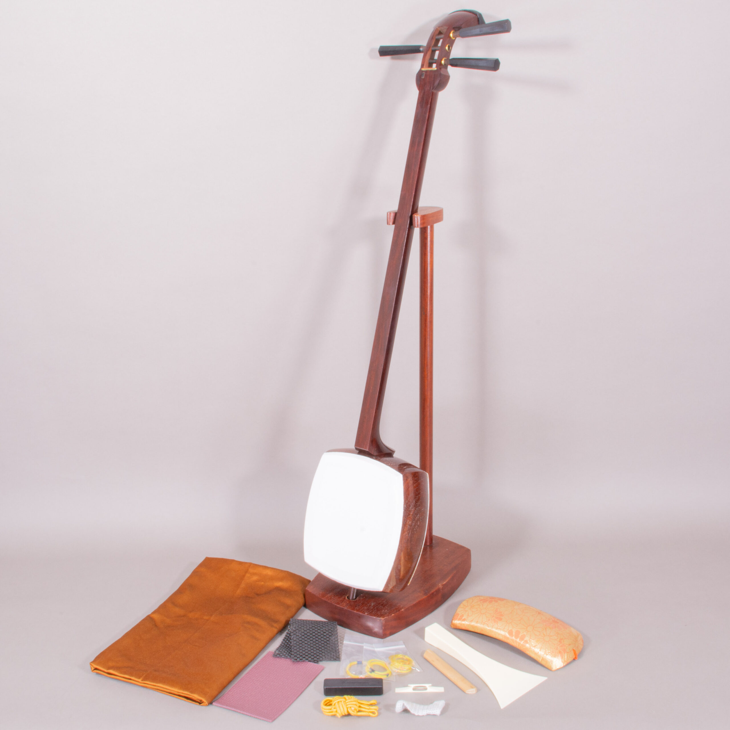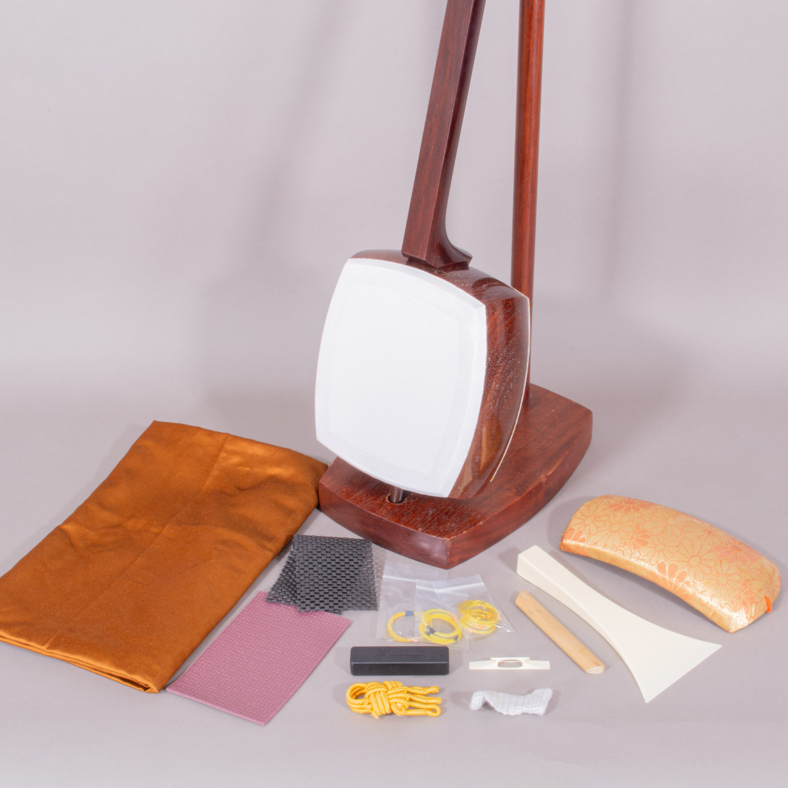Included is a refurbished Bachi, ebony Itomaki tuning pegs, Doukake protector, Yubikake finger sleeve, complete Ito string set, Dou Gomu protective pad, Neo, Koma, and a Naga Fukuro storage bag.