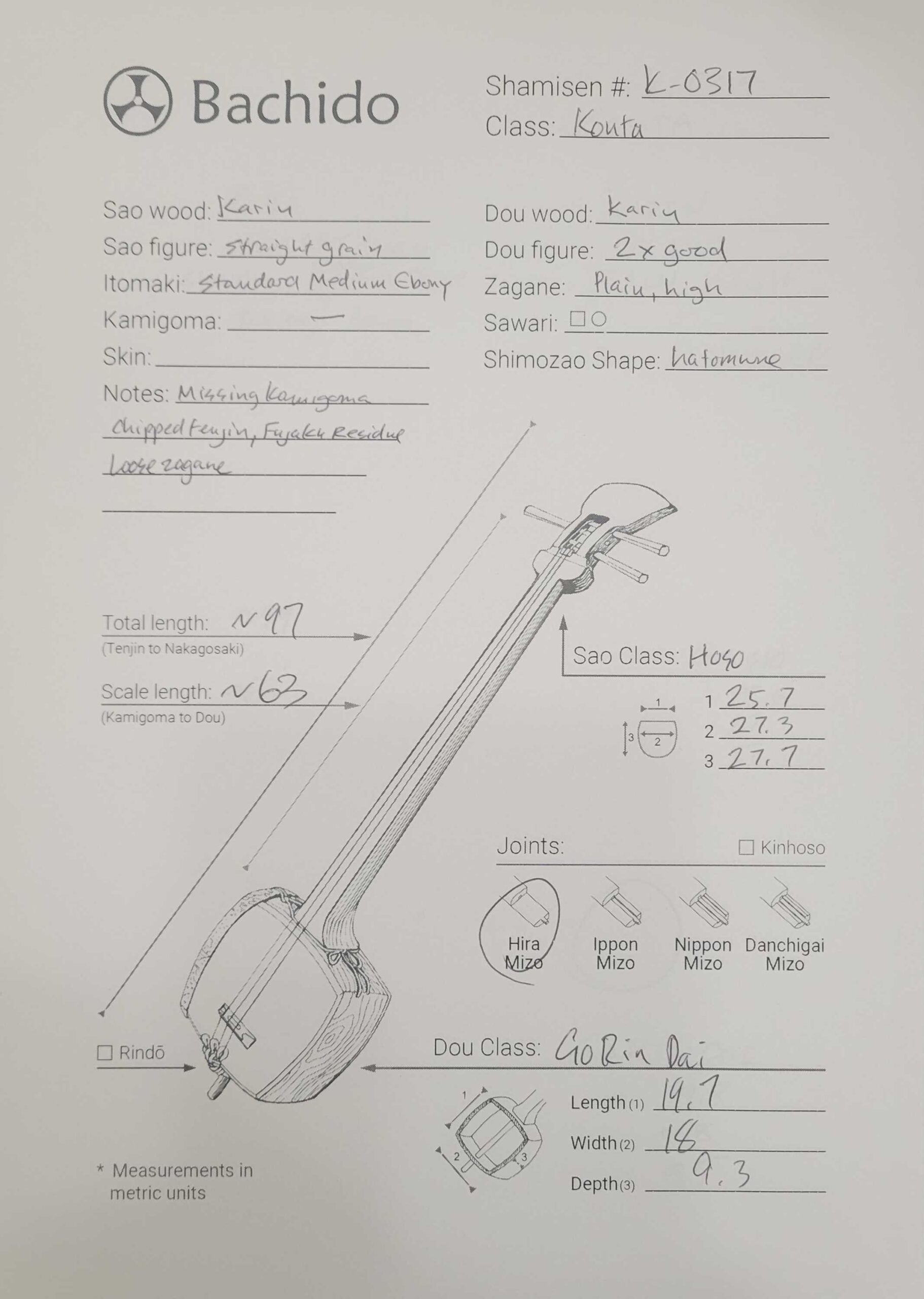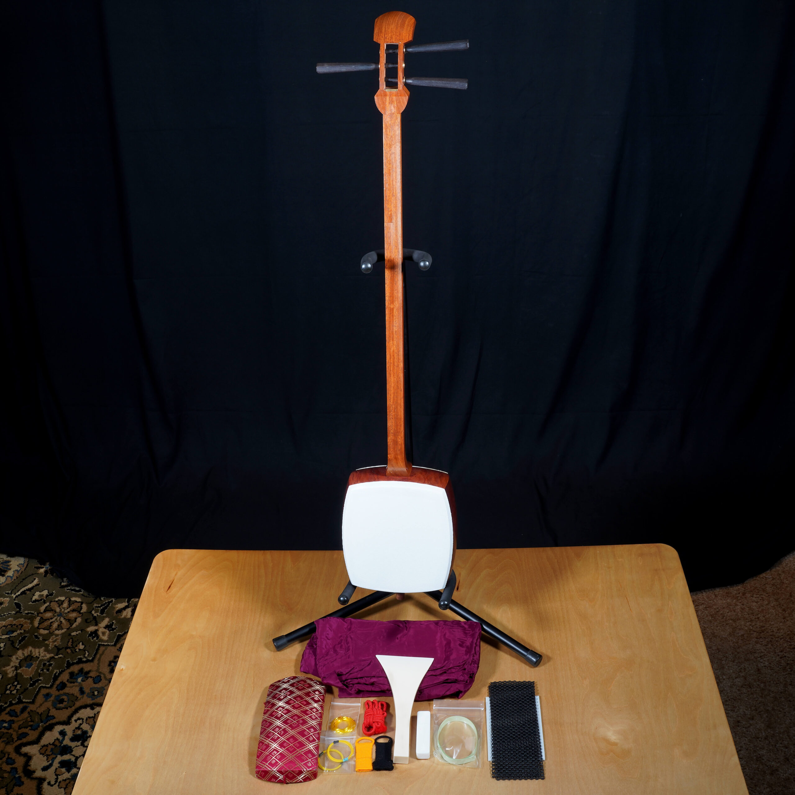 The accessories kit included is second hand. Included is a refurbished Bachi, ebony Itomaki tuning pegs, Doukake protector, Yubikake finger sleeve, complete Ito string set, Dou Gomu protective pad, Neo, Koma, Fujaku Strip and a Naga Fukuro storage bag.