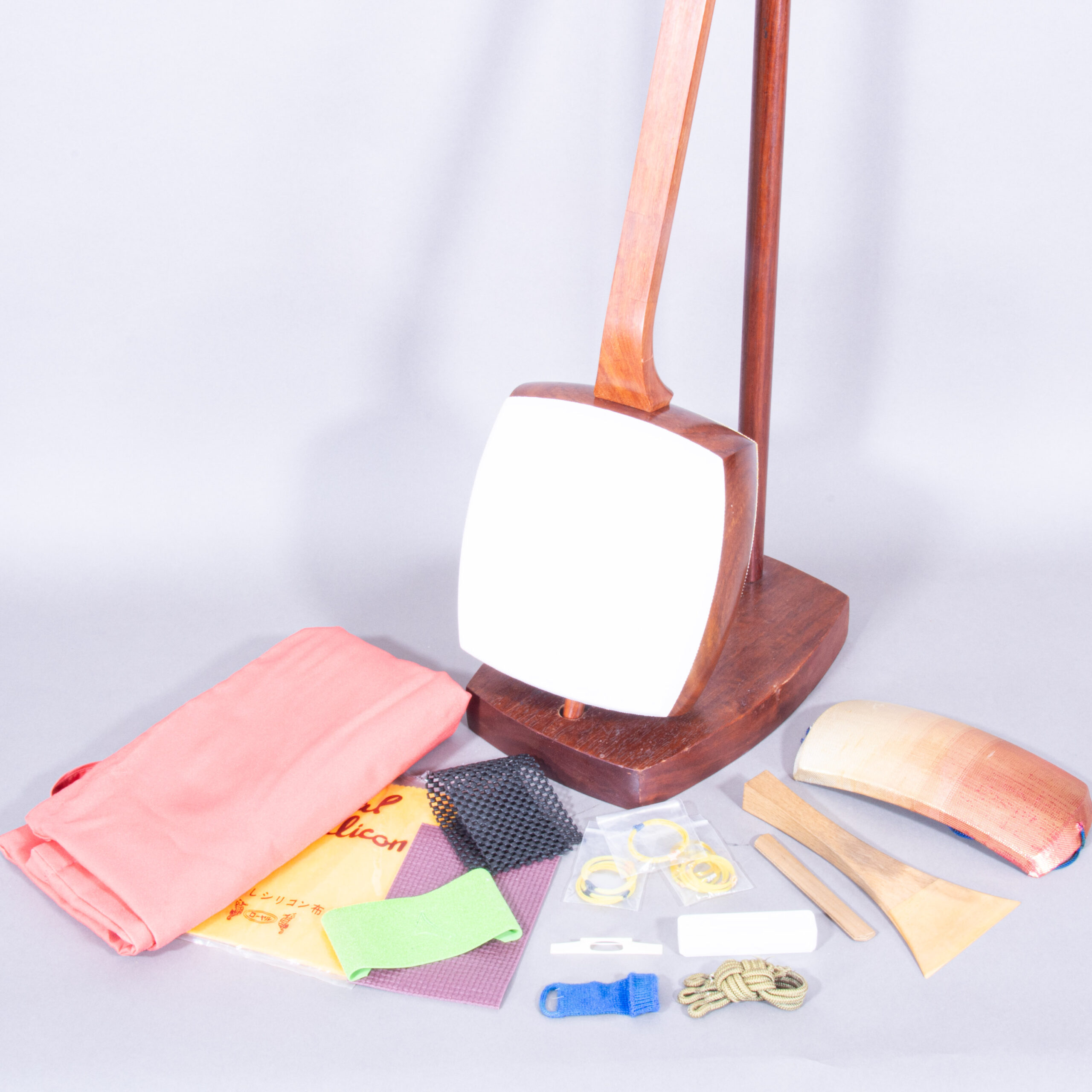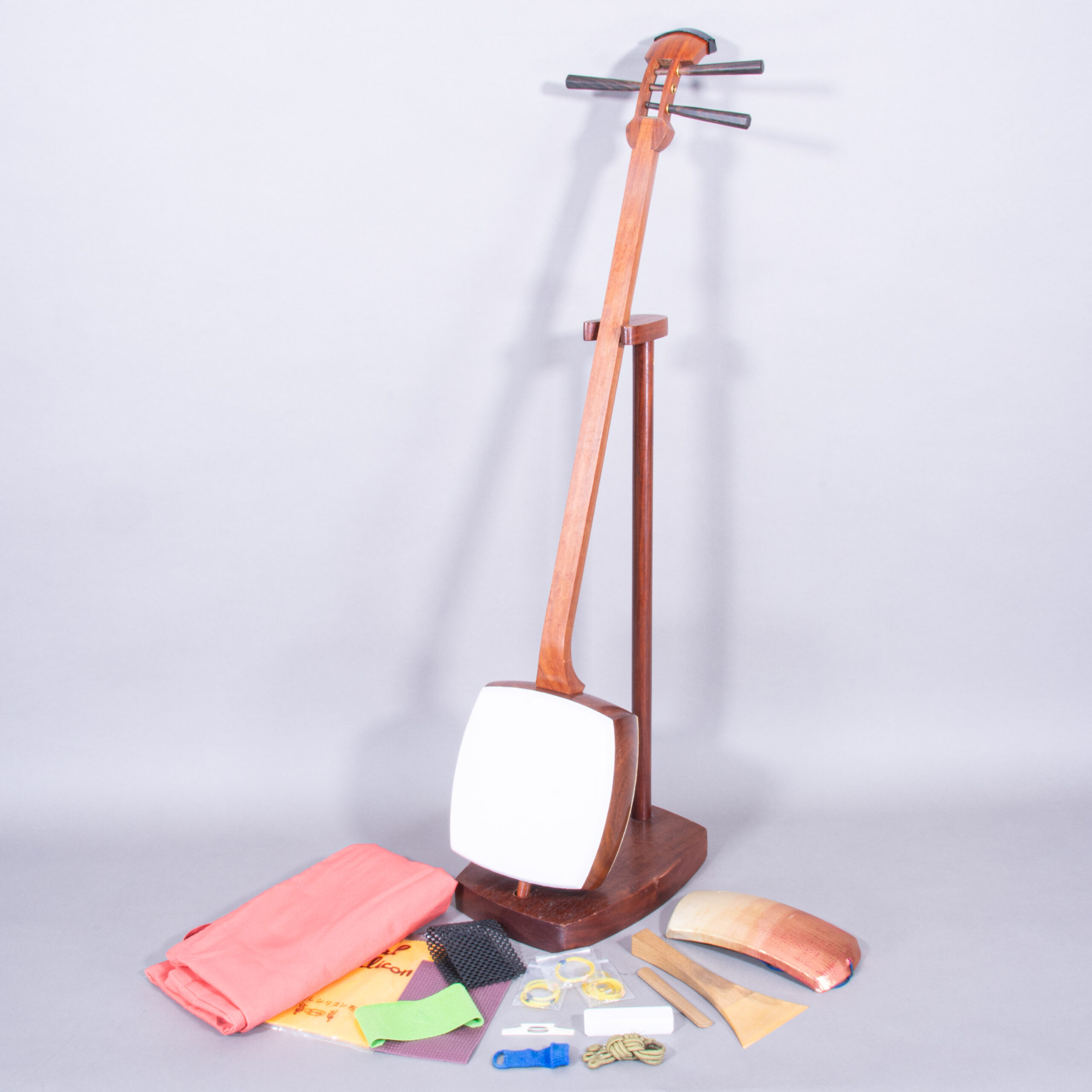 Included is a refurbished Bachi, ebony Itomaki tuning pegs, Doukake protector, Yubikake finger sleeve, complete Ito string set, Dou Gomu protective pad, Neo, Koma, Fujaku Strip and a Naga Fukuro storage bag.