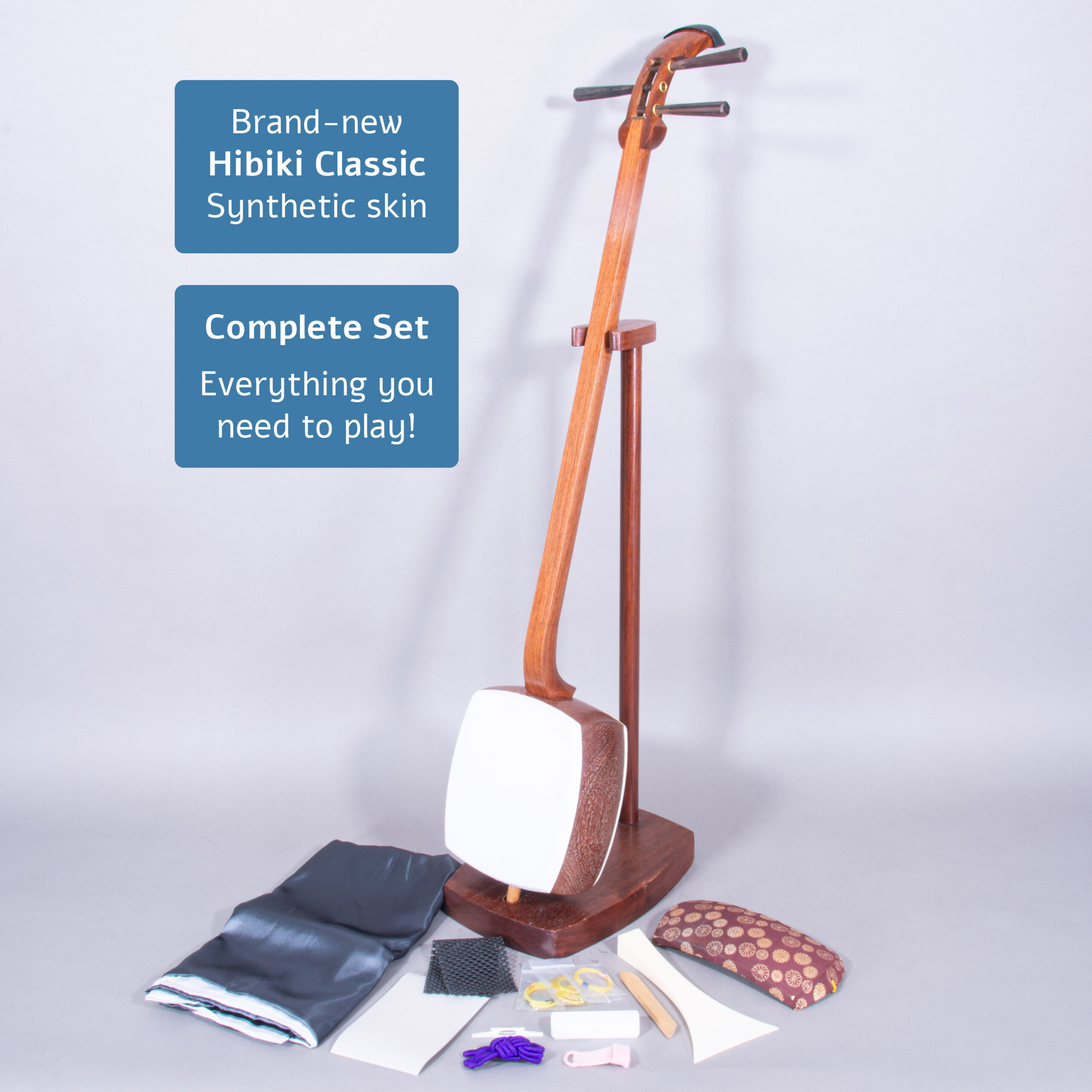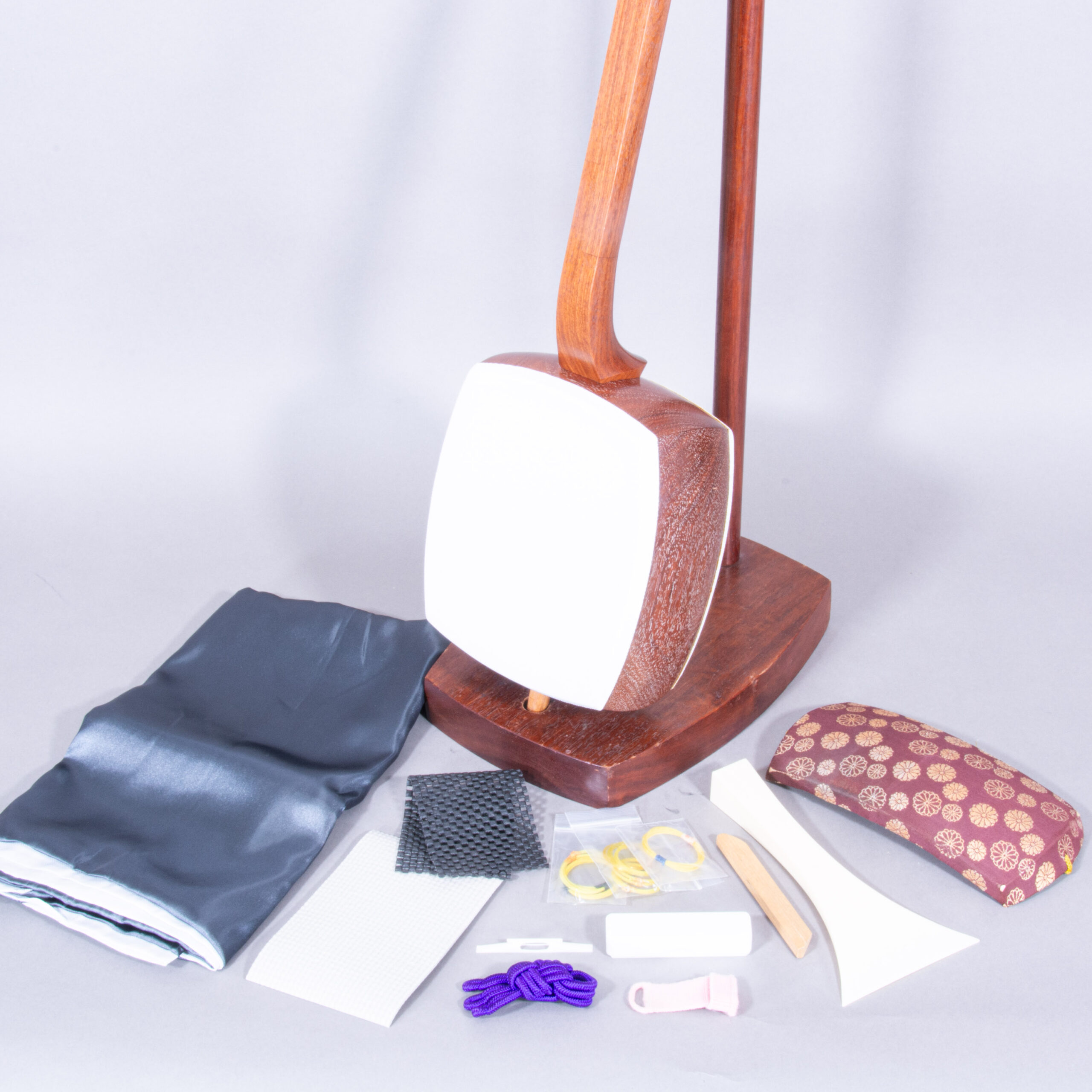 Included is a refurbished Bachi, ebony Itomaki tuning pegs, Doukake protector, Yubikake finger sleeve, complete Ito string set, Dou Gomu protective pad, Neo, Koma, Fujaku Strip and a Naga Fukuro storage bag.