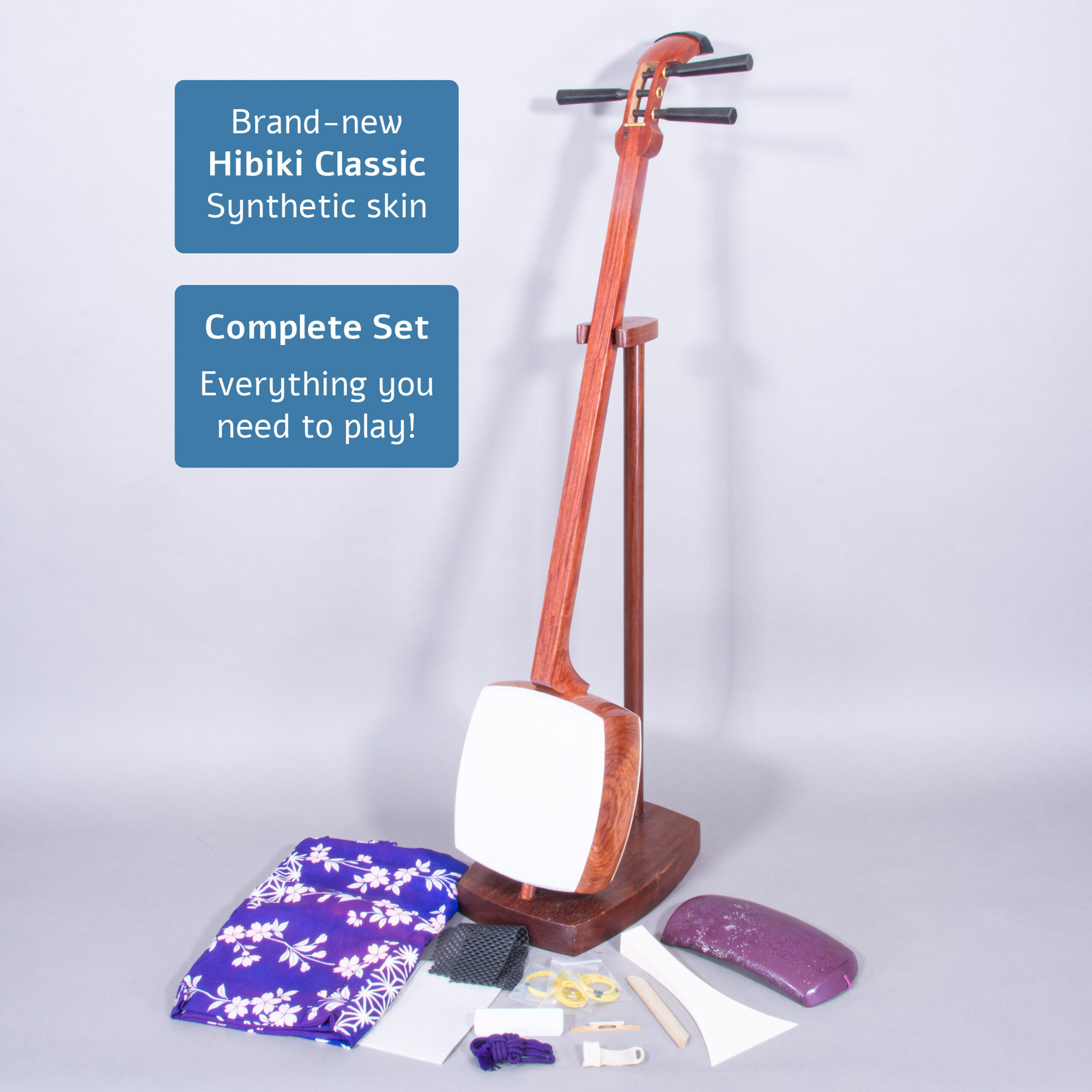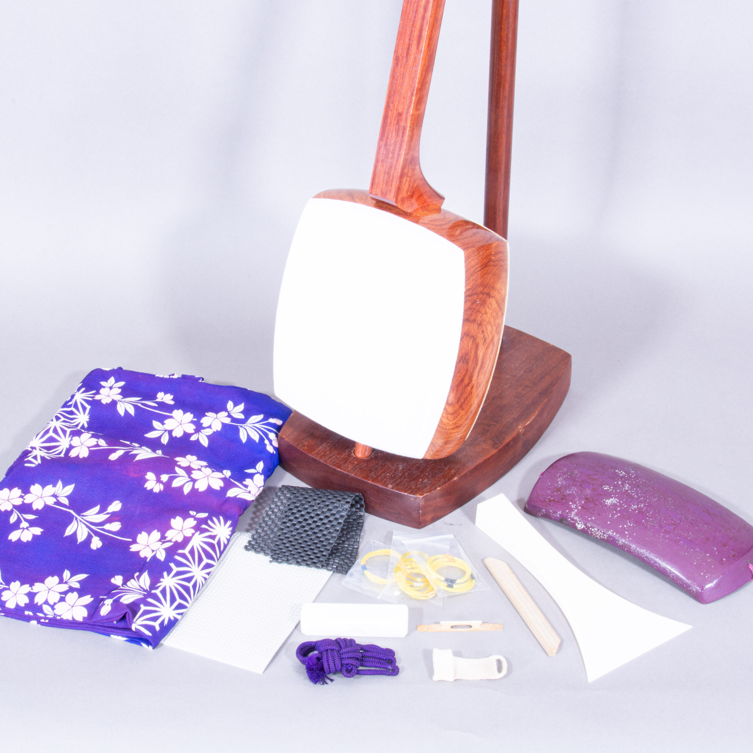 Included is a refurbished Bachi, ebony Itomaki tuning pegs, Doukake protector, Yubikake finger sleeve, complete Ito string set, Dou Gomu protective pad, Neo, Koma, Fujaku Strip and a Naga Fukuro storage bag.