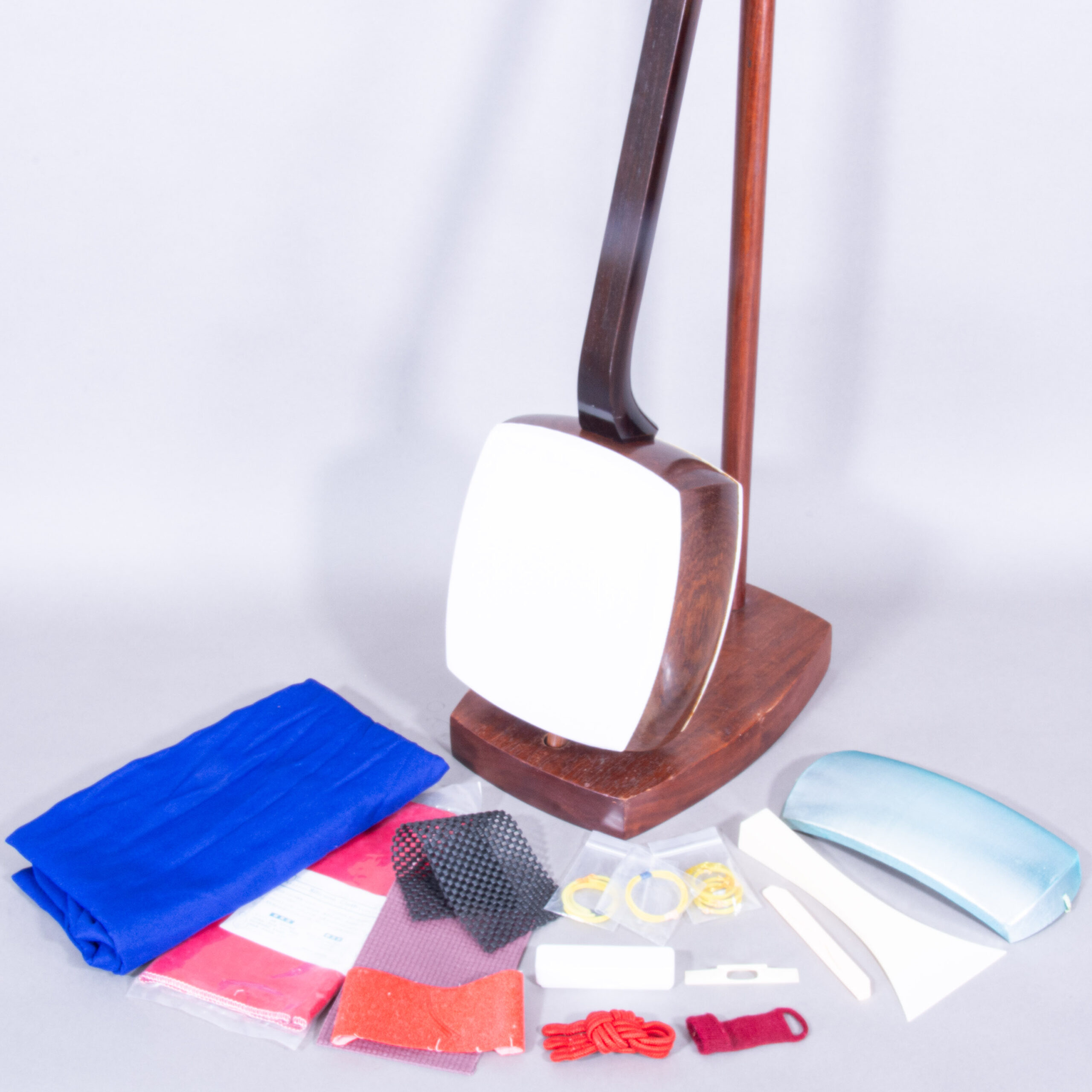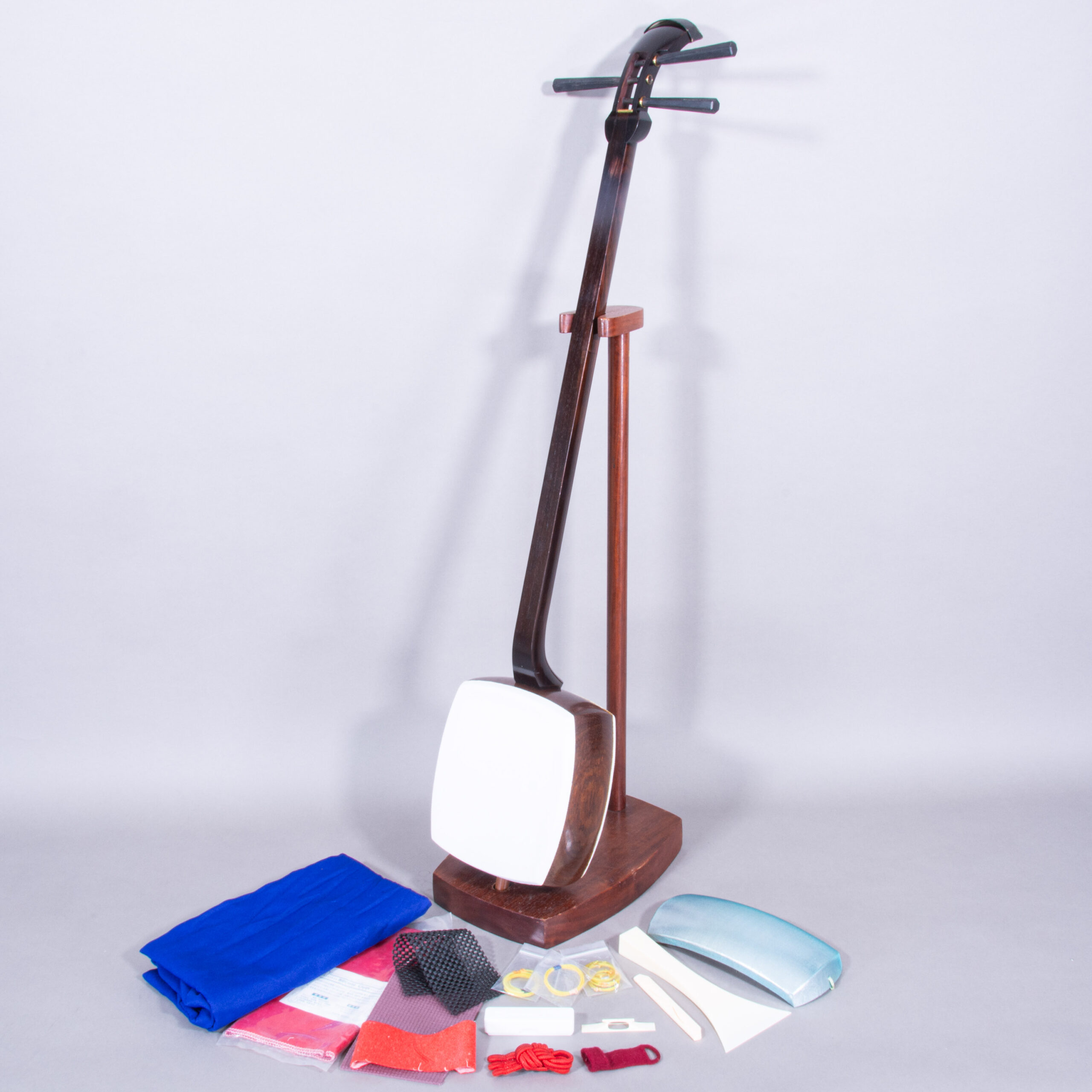 Included is a refurbished Bachi, ebony Itomaki tuning pegs, Doukake protector, Yubikake finger sleeve, complete Ito string set, Dou Gomu protective pad, Neo, Koma, Fujaku strip, and a Naga Fukuro storage bag.