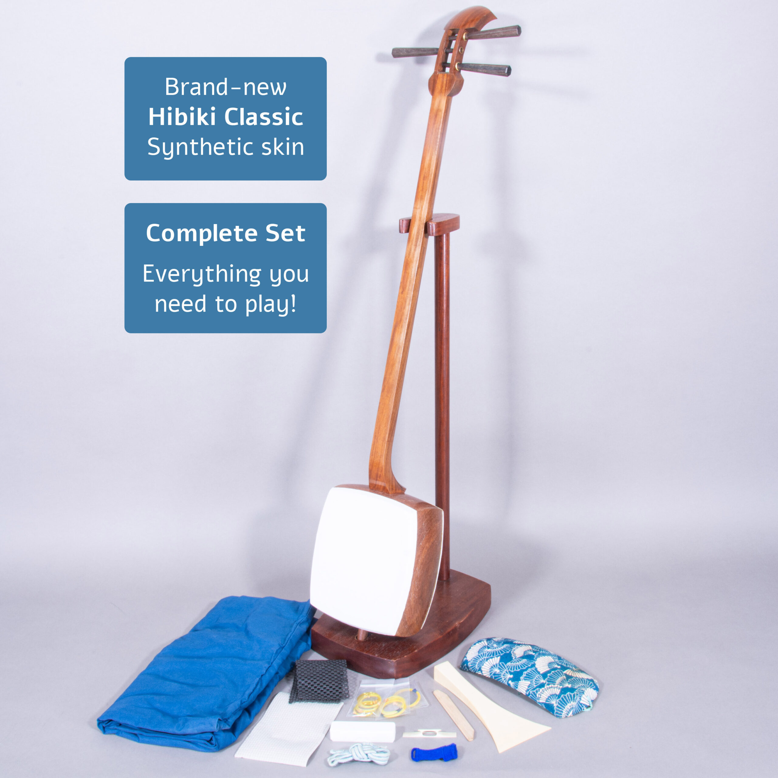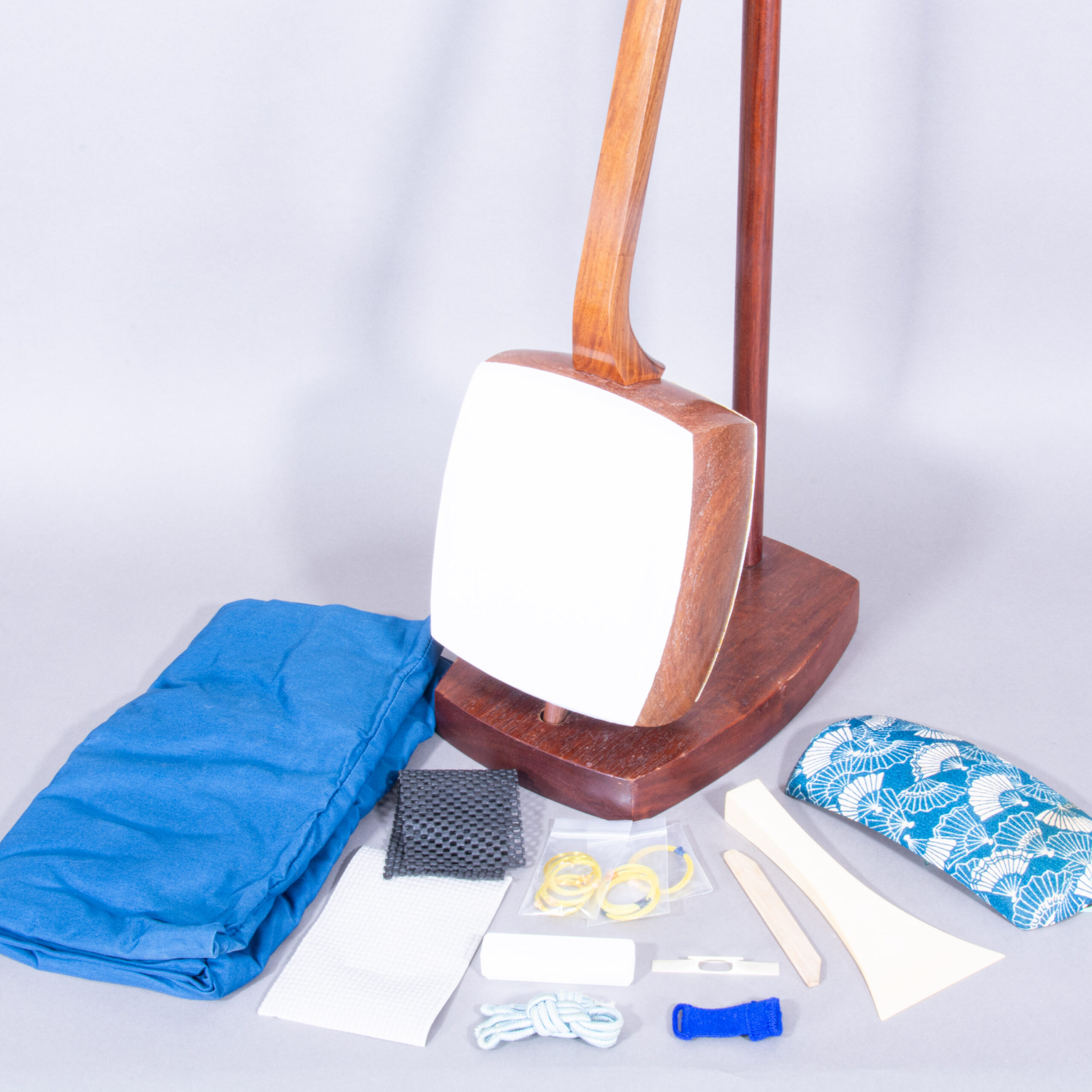 Included is a refurbished Bachi, ebony Itomaki tuning pegs, Doukake protector, Yubikake finger sleeve, complete Ito string set, Dou Gomu protective pad, Neo, Koma, Fujaku Strip and a Naga Fukuro storage bag.