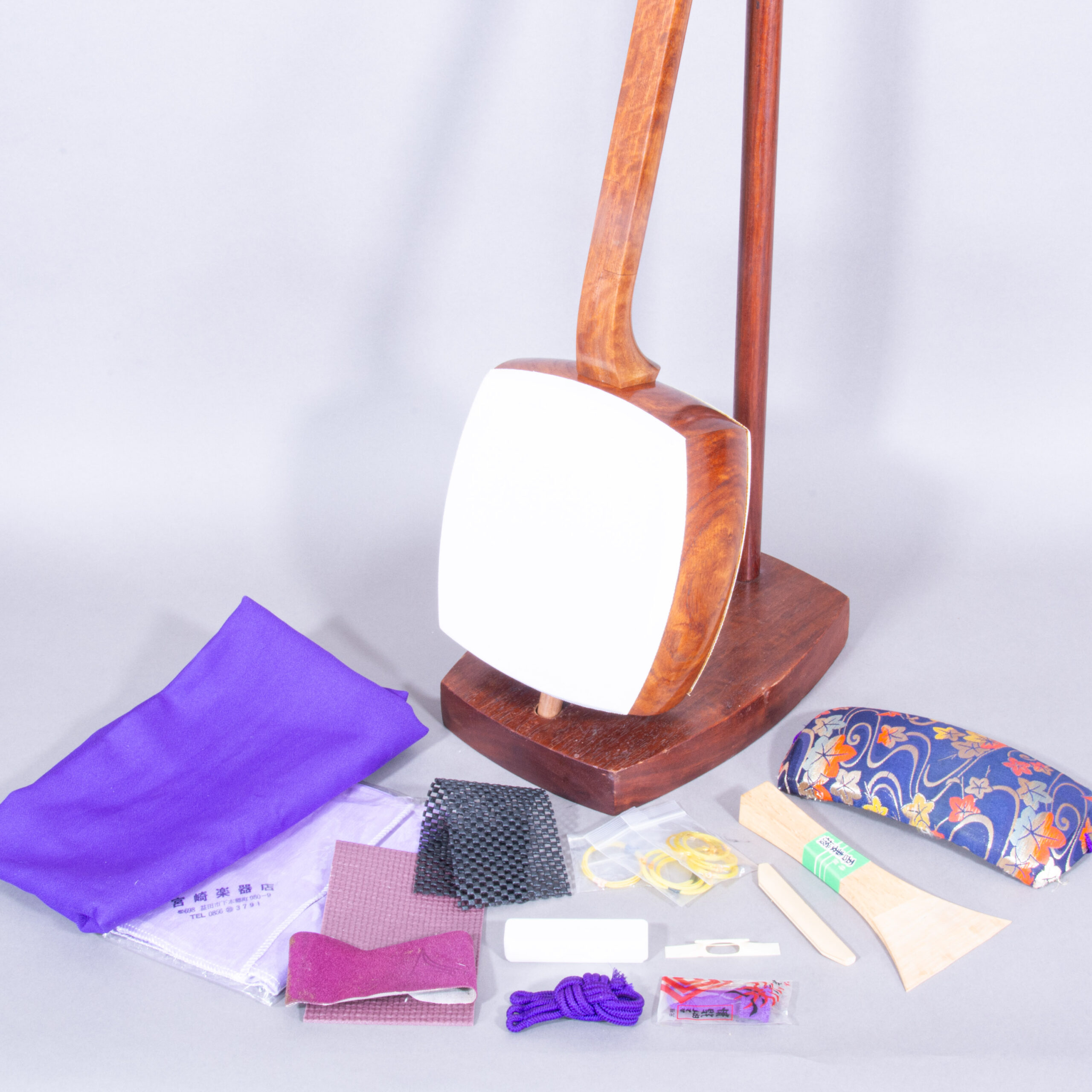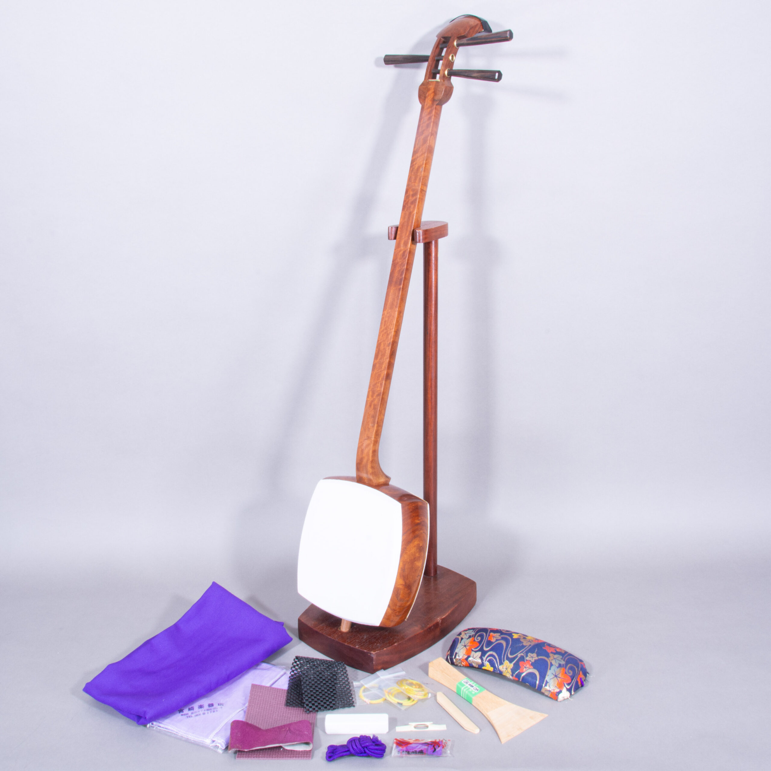 Included is a refurbished Bachi, ebony Itomaki tuning pegs, Doukake protector, Yubikake finger sleeve, complete Ito string set, Dou Gomu protective pad, Neo, Koma, and a Naga Fukuro storage bag.