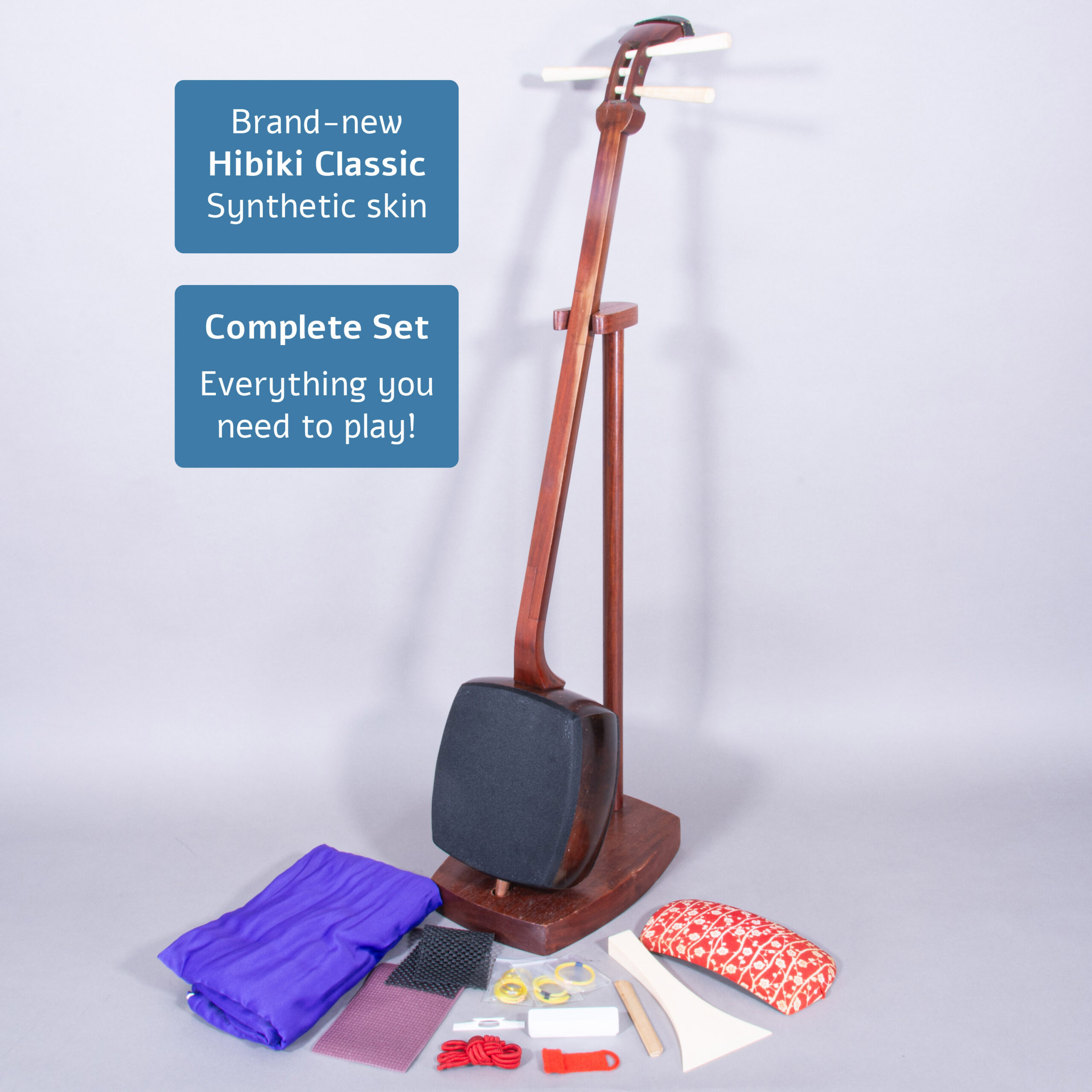 Included is a refurbished Bachi, ebony Itomaki tuning pegs, Doukake protector, Yubikake finger sleeve, complete Ito string set, Dou Gomu protective pad, Neo, Koma, Fujaku Strip and a Naga Fukuro storage bag.