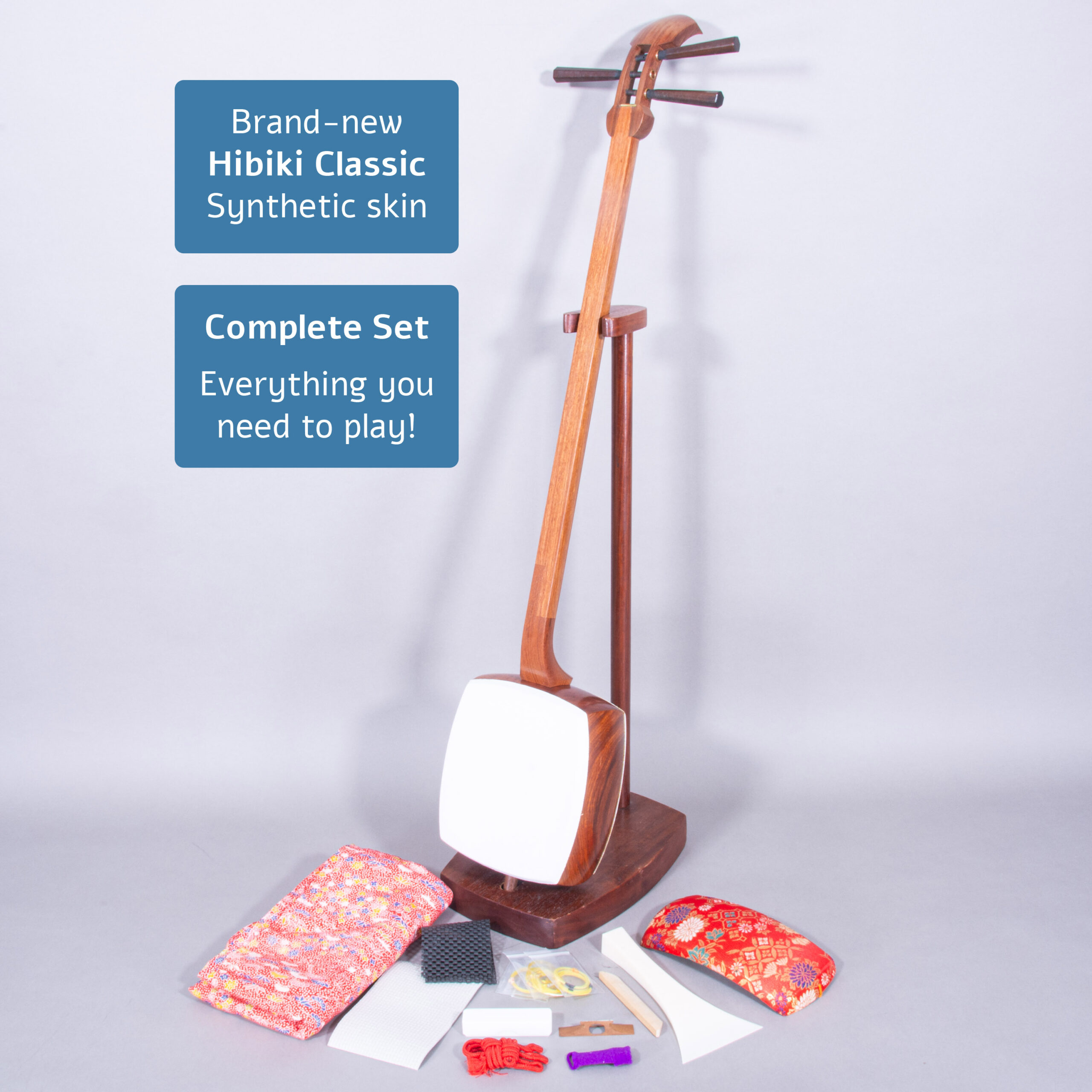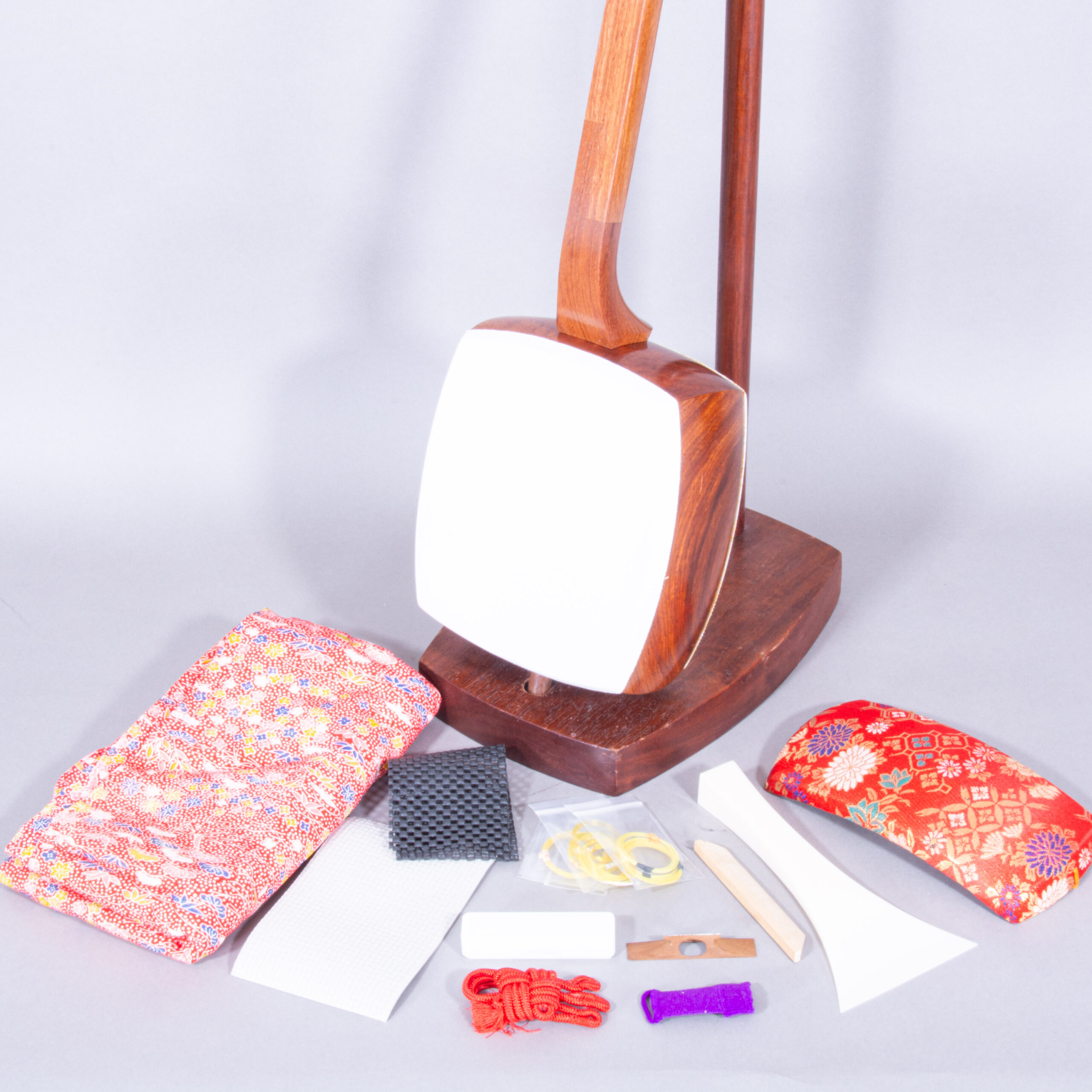 Included is a refurbished Bachi, ebony Itomaki tuning pegs, Doukake protector, Yubikake finger sleeve, complete Ito string set, Dou Gomu protective pad, Neo, Koma, Fujaku Strip and a Naga Fukuro storage bag.
