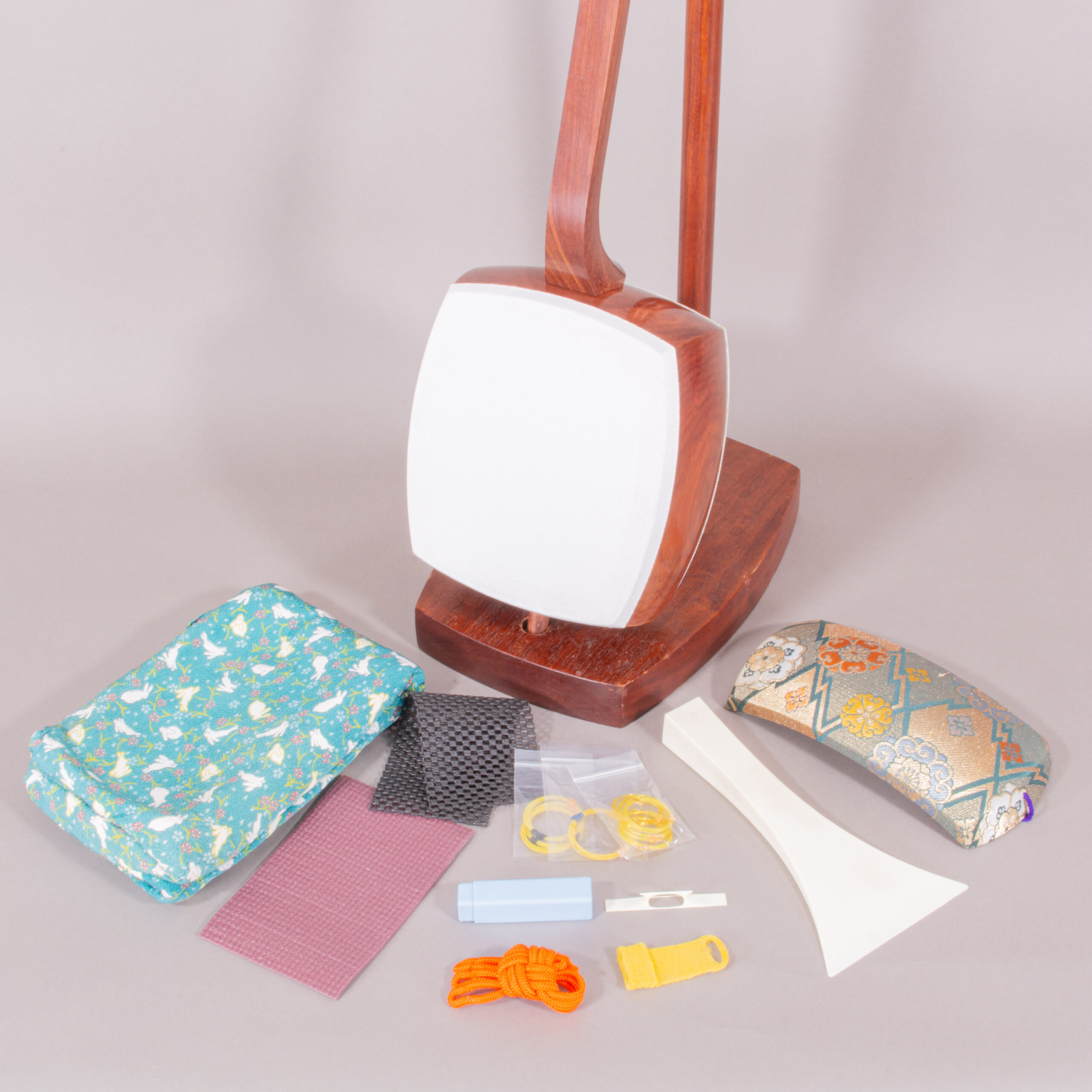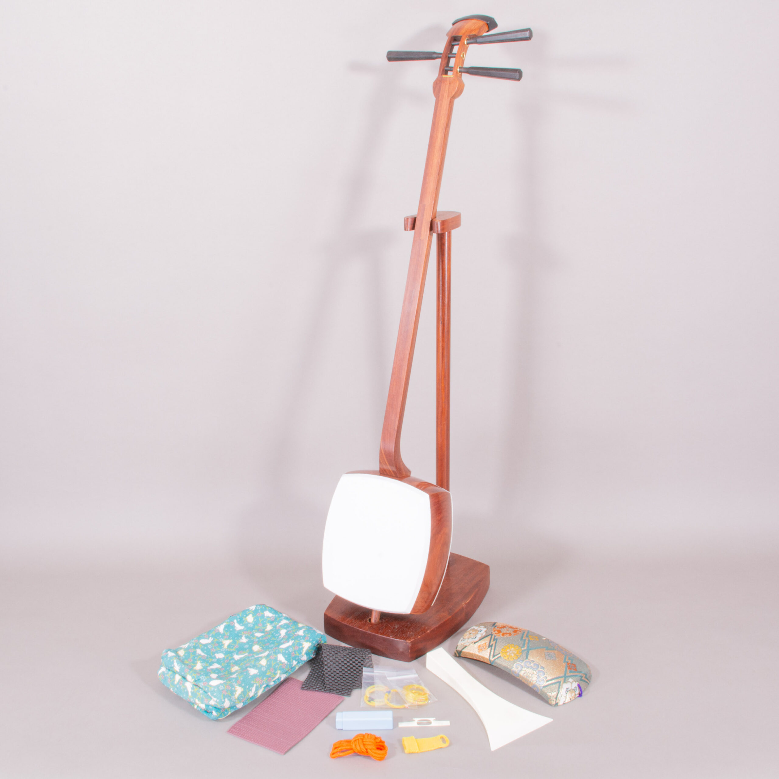 Included is a refurbished Bachi, ebony Itomaki tuning pegs, Doukake protector, Yubikake finger sleeve, complete Ito string set, Dou Gomu protective pad, Neo, Koma, Fujaku Strip and a Naga Fukuro storage bag.