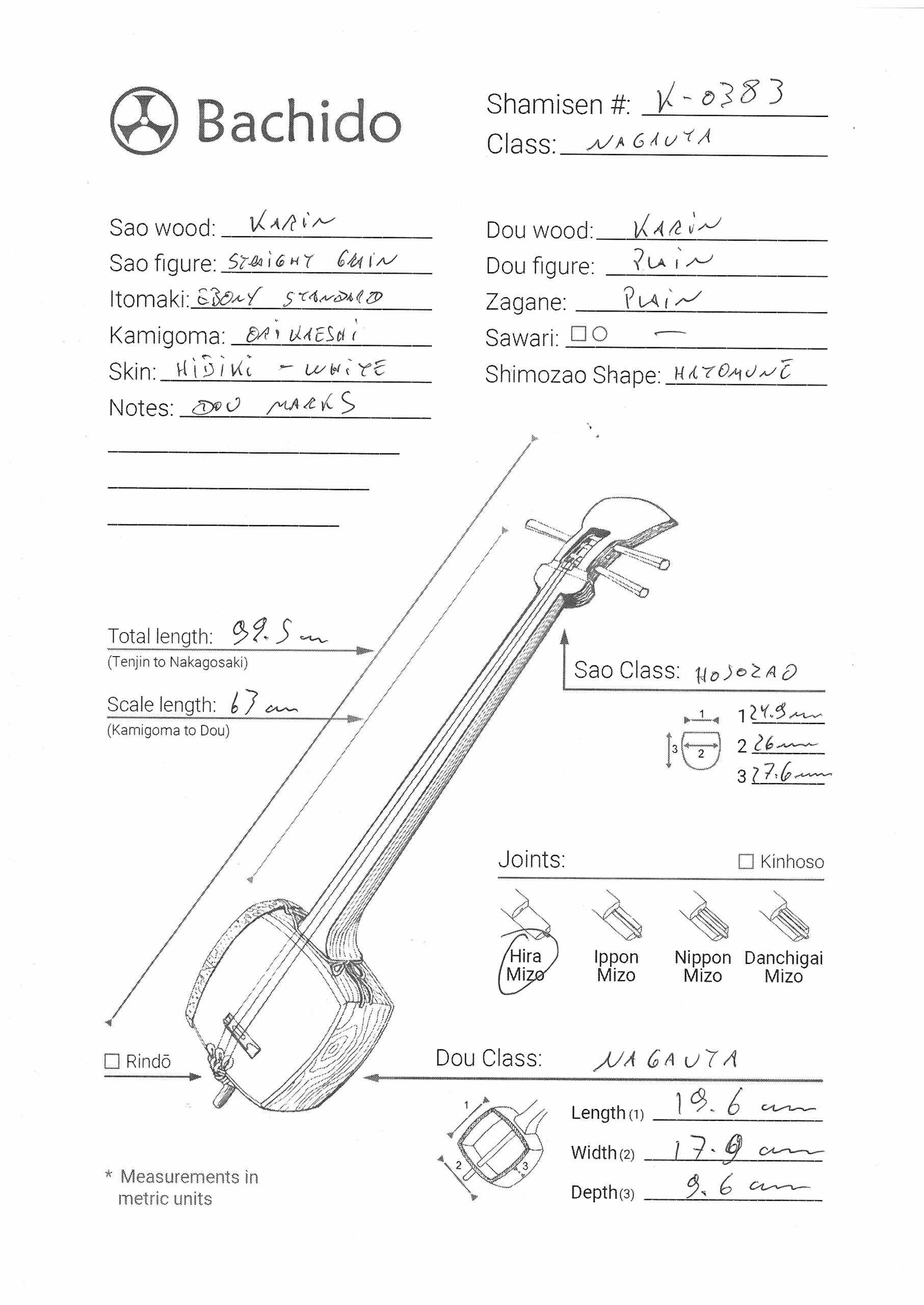 This shamisen is brand new (the same sold as the Starter Set), though the Dou was scuffed on several spots all around by an apprentice during the skinning process, so it’s being sold at a deep discount.