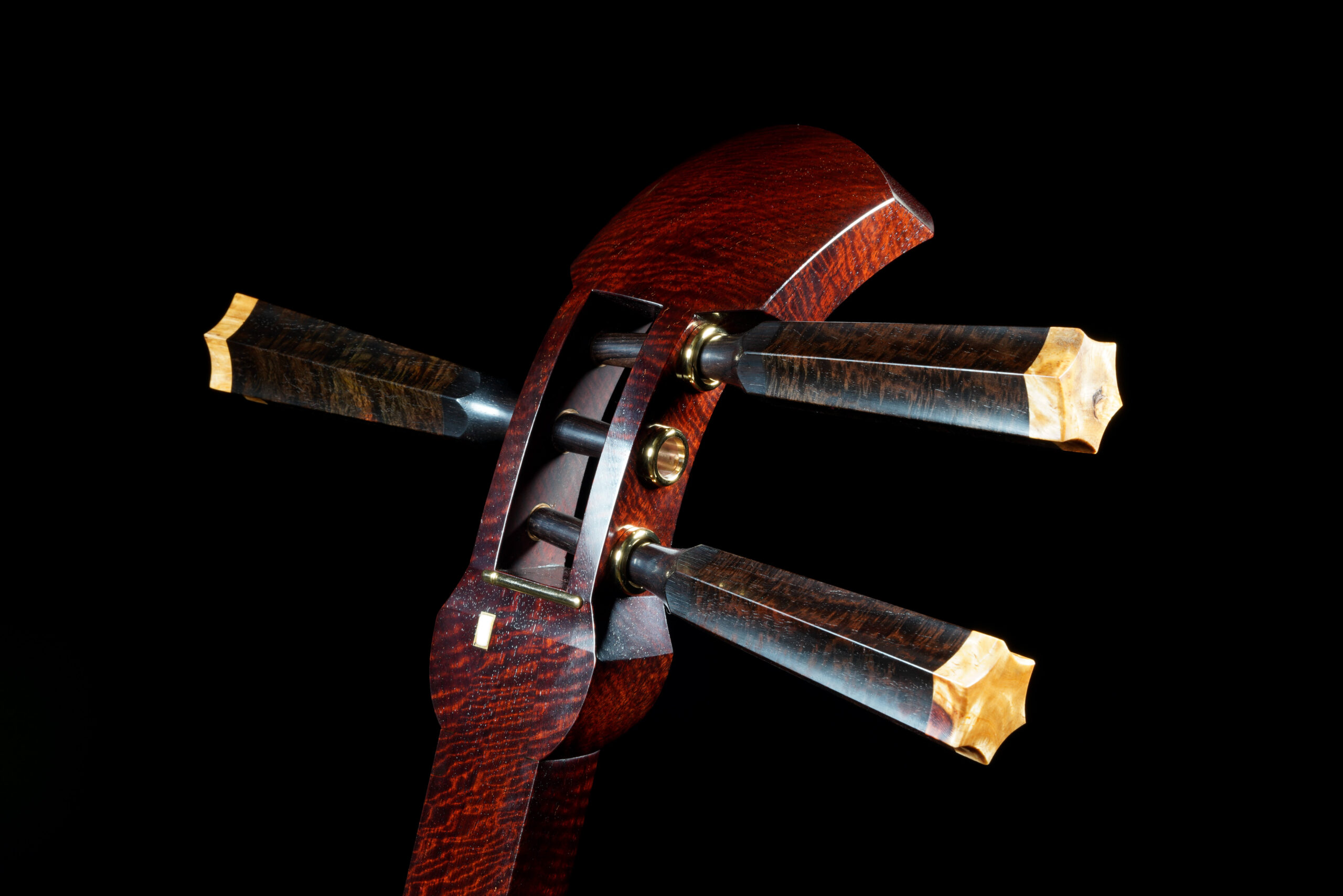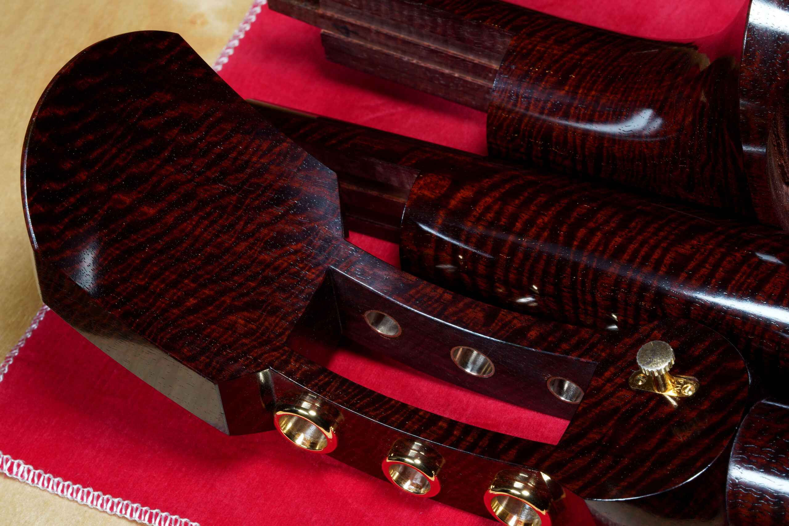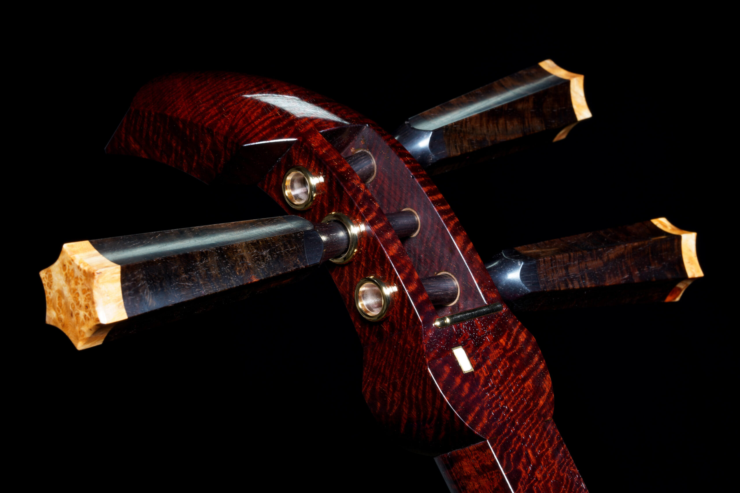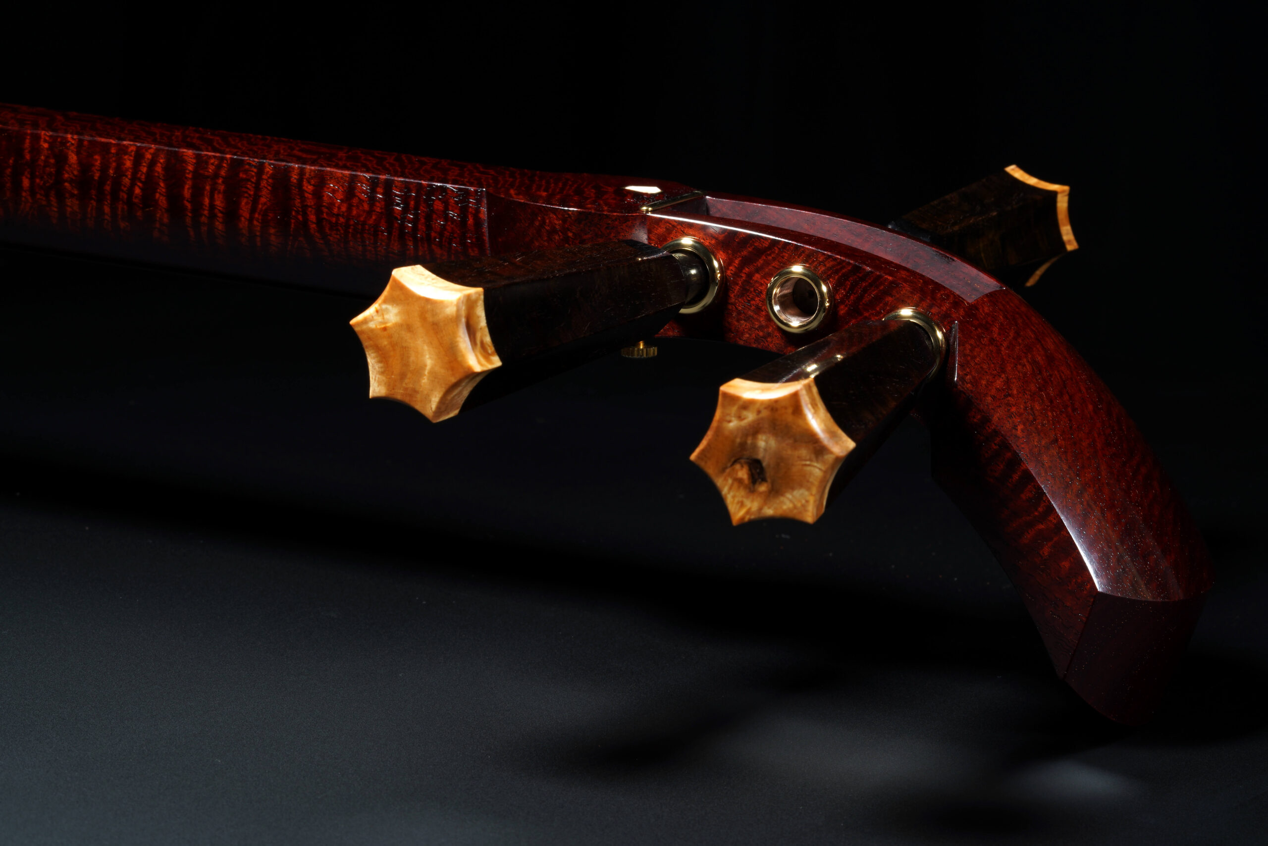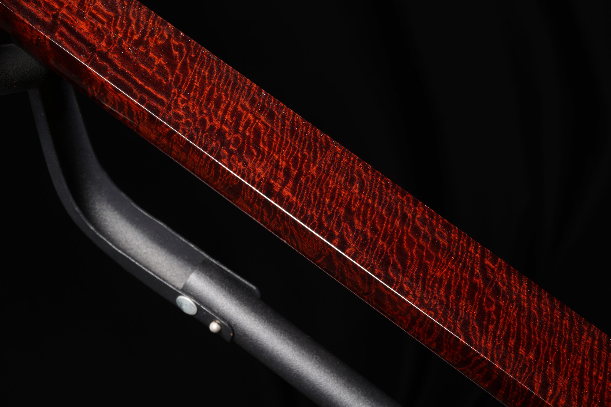 As the original itomaki wouldn’t fit into the new zagane (which are slightly larger than they used to be), I installed my Phoenix line of Elite Itomaki, the highest tier with incredible dark curly siamese rosewood and amboyna burl caps!