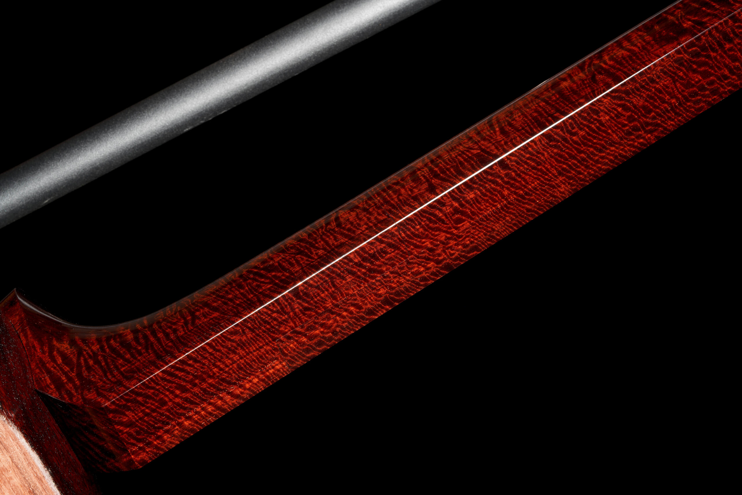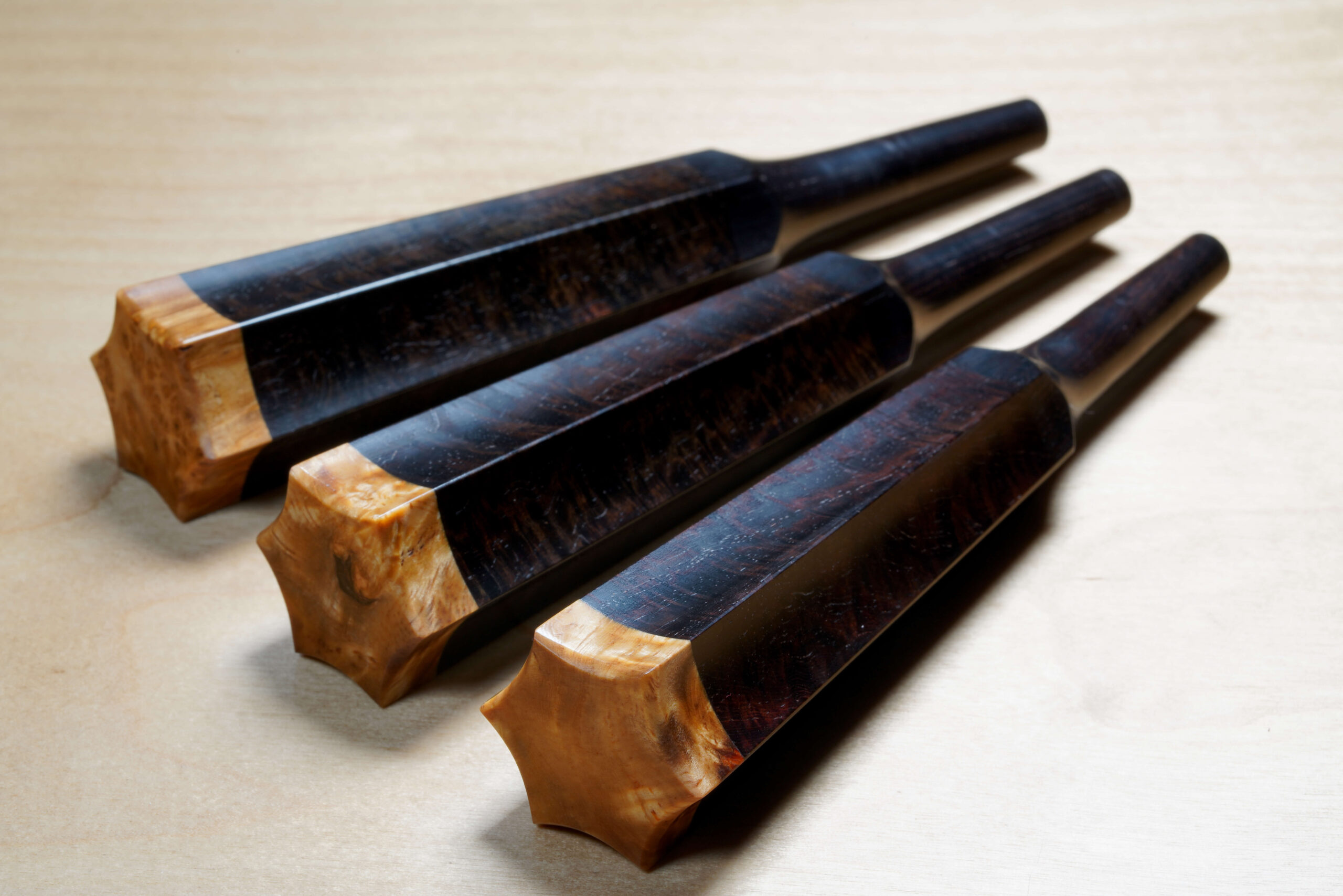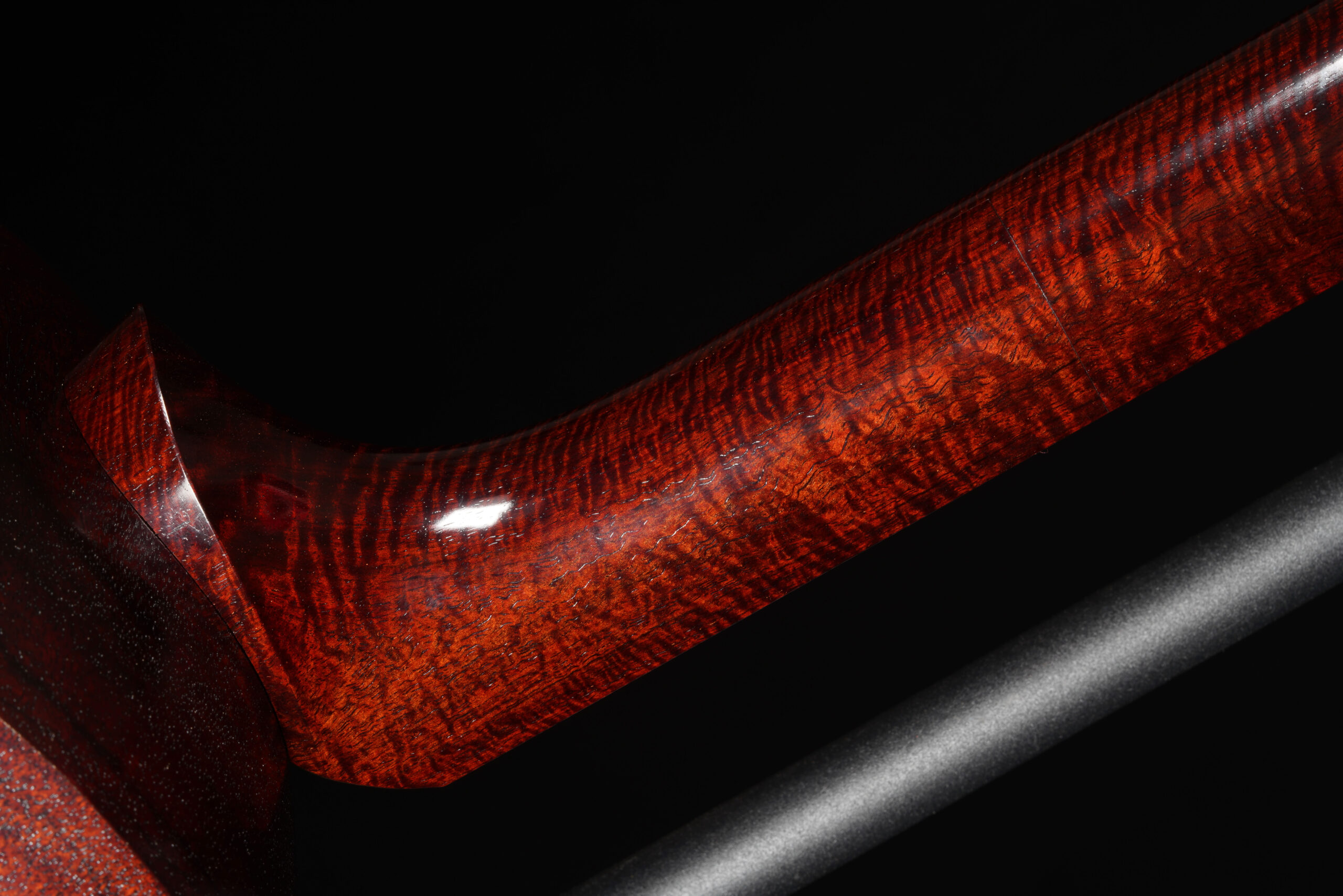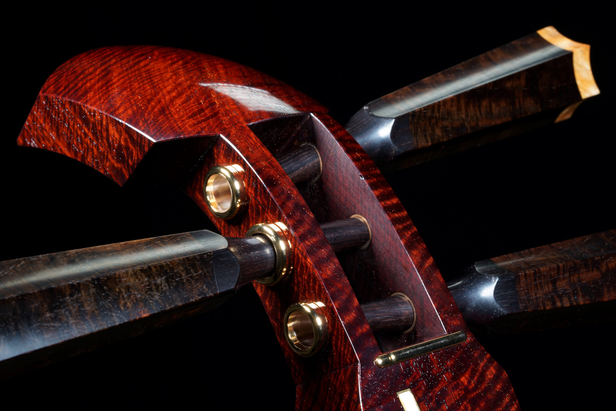 As the original itomaki wouldn’t fit into the new zagane (which are slightly larger than they used to be), I installed my Phoenix line of Elite Itomaki, the highest tier with incredible dark curly siamese rosewood and amboyna burl caps!