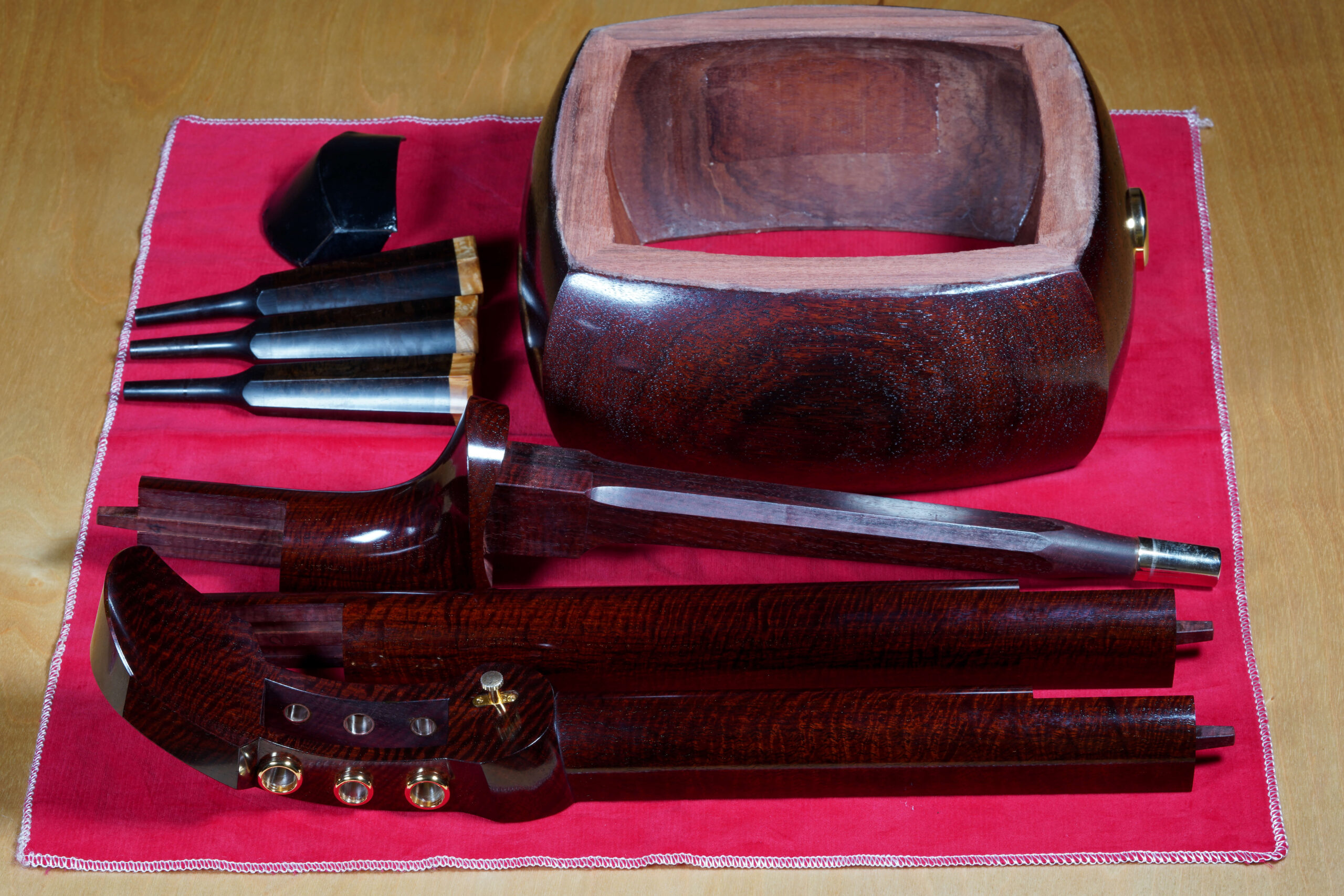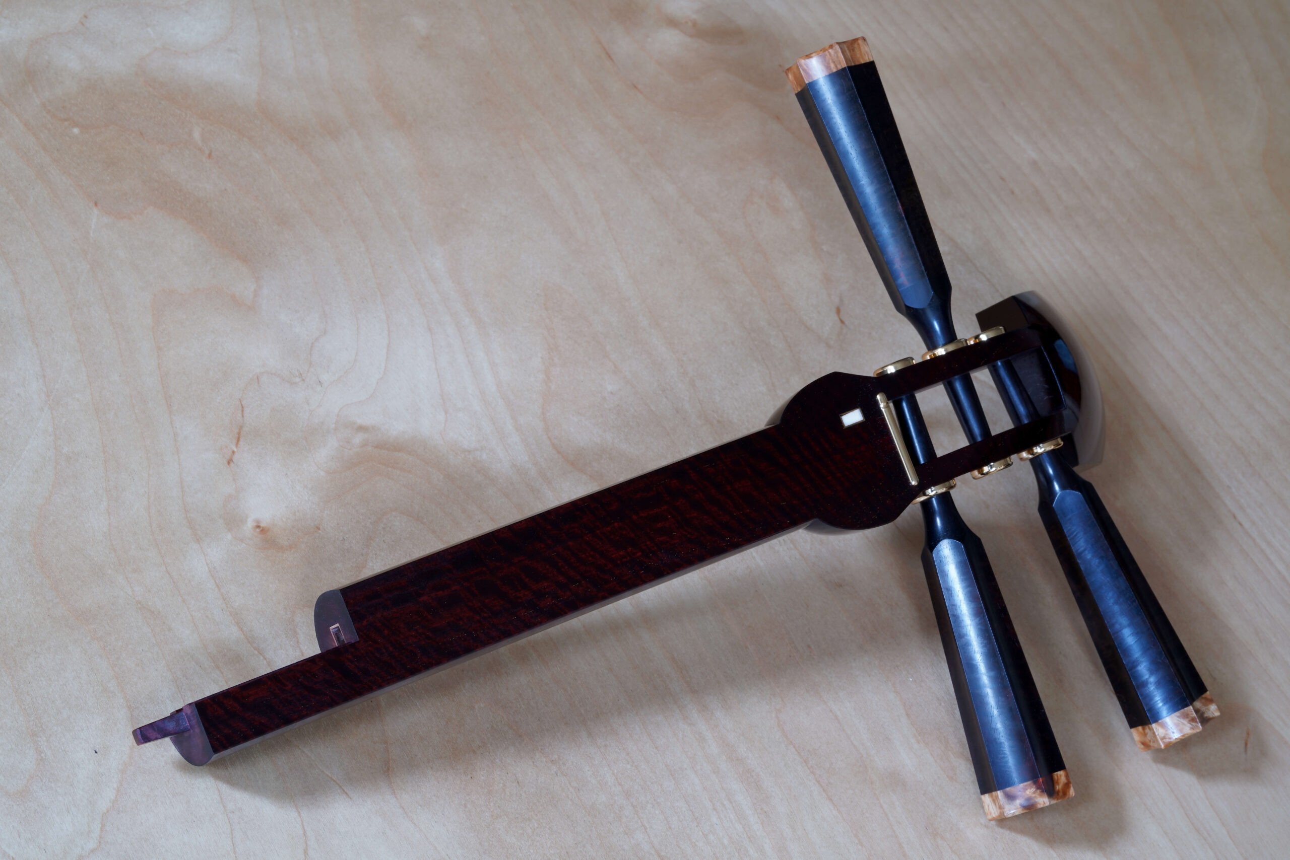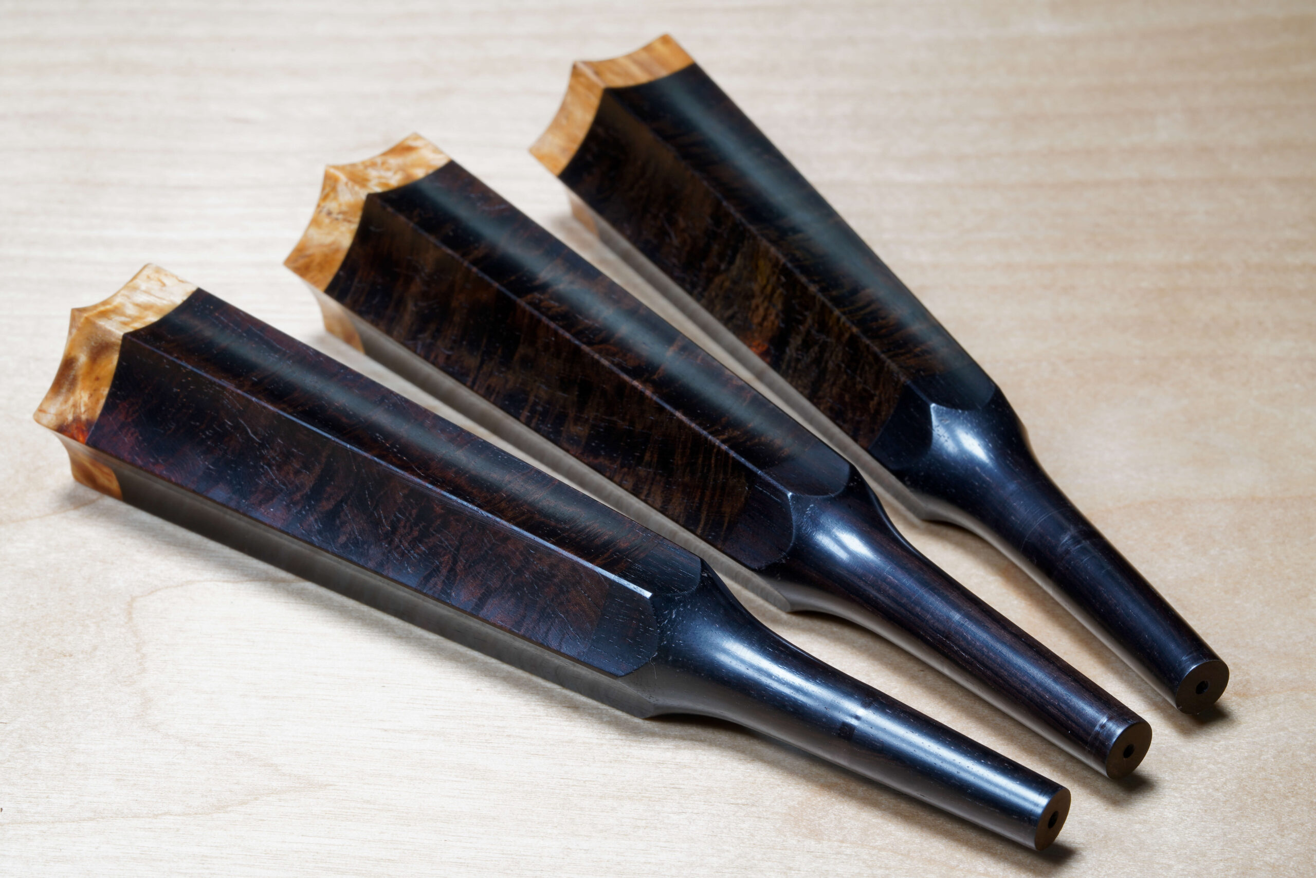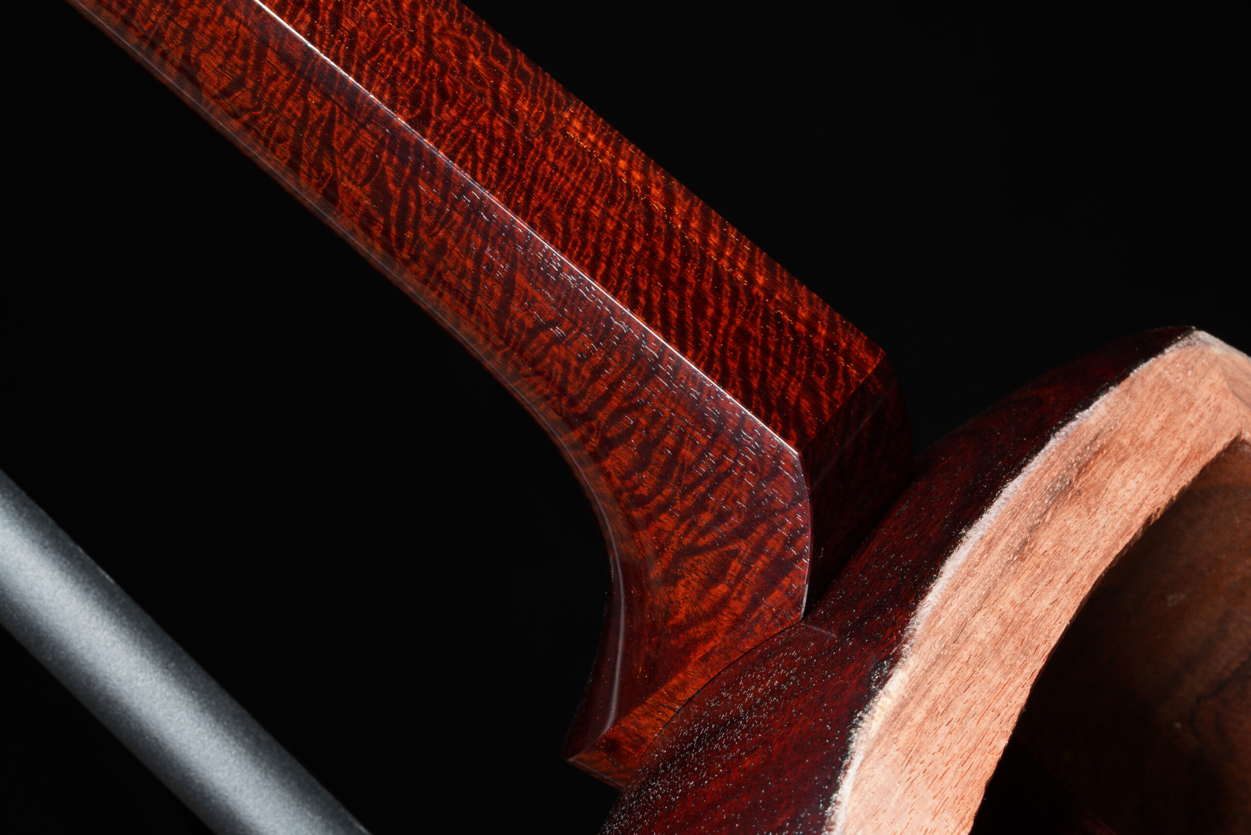 As the original itomaki wouldn’t fit into the new zagane (which are slightly larger than they used to be), I installed my Phoenix line of Elite Itomaki, the highest tier with incredible dark curly siamese rosewood and amboyna burl caps!